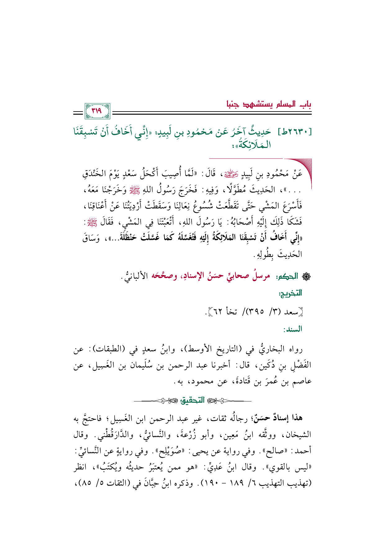 رواه البخاريُّ في (التاريخ الأوسط)، وابنُ سعدٍ في (الطبقات): عن الفَضْلِ بنِ دُكَين، قال: أخبرنا عبد الرحمن بن سُلَيمان بن الغَسِيل، عن عاصم بن عُمرَ بن قَتادةَ، عن محمود، به.