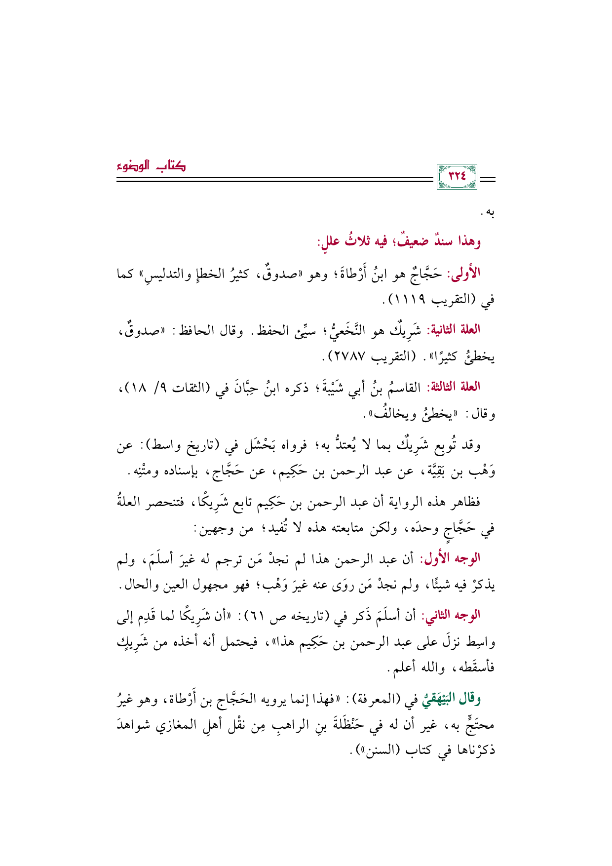 الوجه الثاني: أن أسلَمَ ذَكر في (تاريخه ص ٦١): "أن شَرِيكًا لما قَدِم إلى واسِط نزلَ على عبد الرحمن بن حَكِيم هذا"، فيحتمل أنه أخذه من شَرِيكٍ فأسقَطه، والله أعلم.