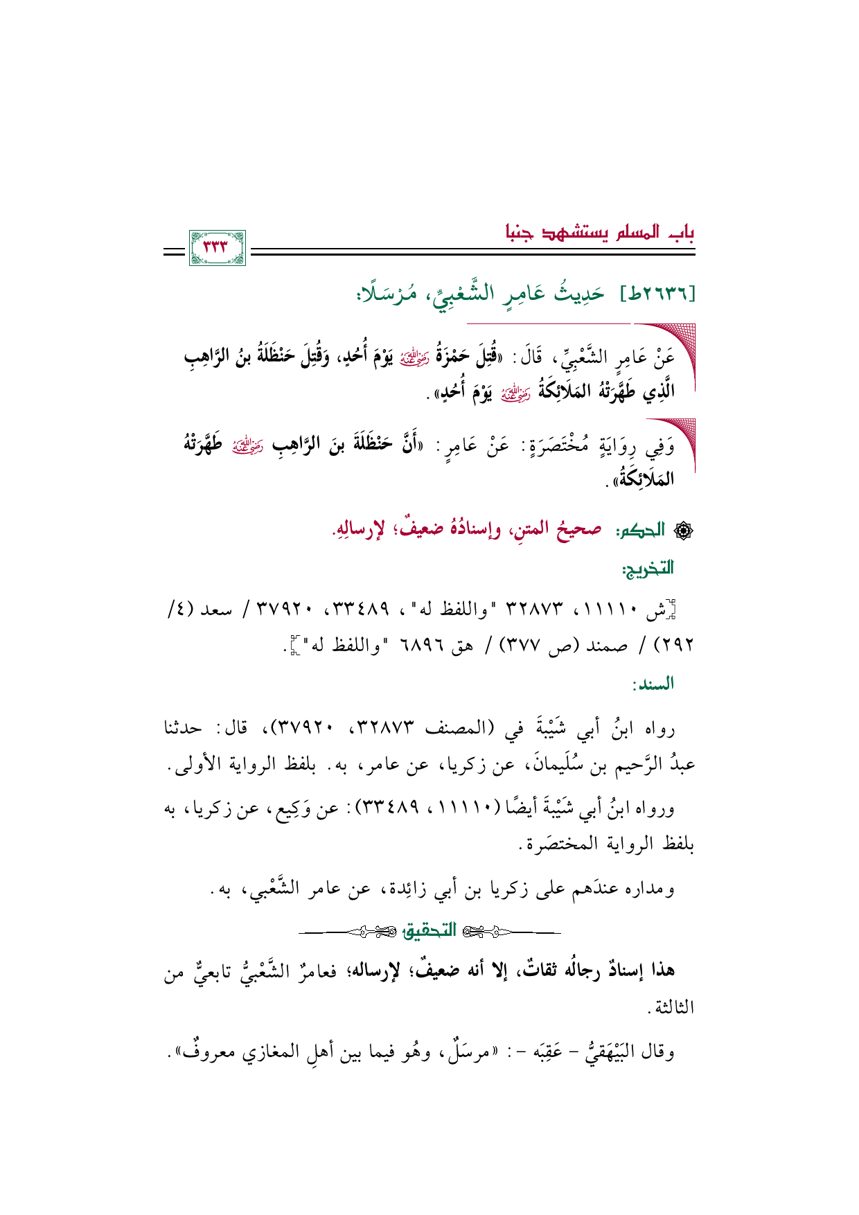 رواه ابنُ أبي شَيْبةَ في (المصنف ٣٢٨٧٣، ٣٧٩٢٠)، قال: حدثنا عبدُ الرَّحيم بن سُلَيمانَ، عن زكريا، عن عامر، به. بلفظ الرواية الأولى.