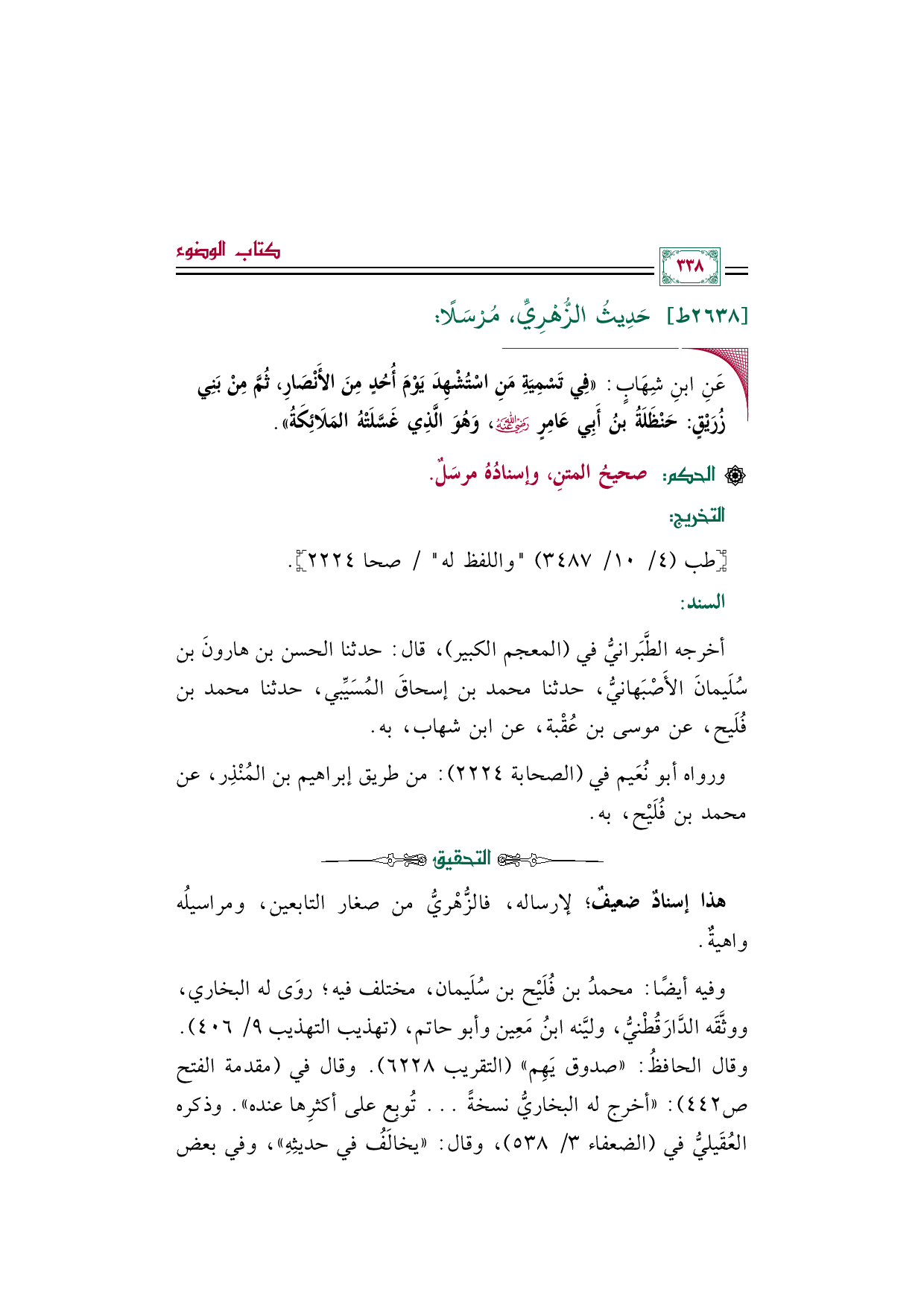 أخرجه الطَّبَرانيُّ في (المعجم الكبير)، قال: حدثنا الحسن بن هارونَ بن سُلَيمانَ الأَصْبَهانيُّ، حدثنا محمد بن إسحاقَ المُسَيِّبي، حدثنا محمد بن فُلَيح، عن موسى بن عُقْبة، عن ابن شهاب، به.