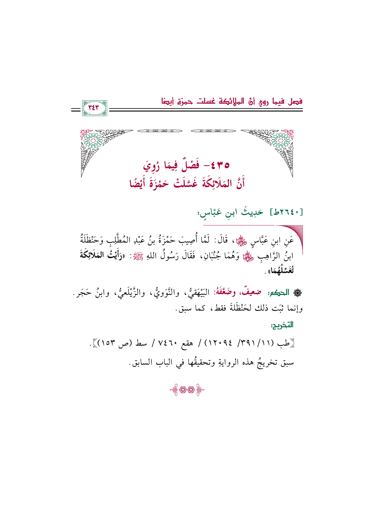 ٤٣٥ - فَصْلٌ فِيمَا رُوِيَ أَنَّ المَلَائِكَةَ غَسَّلَتْ حَمْزَةَ أَيْضًا