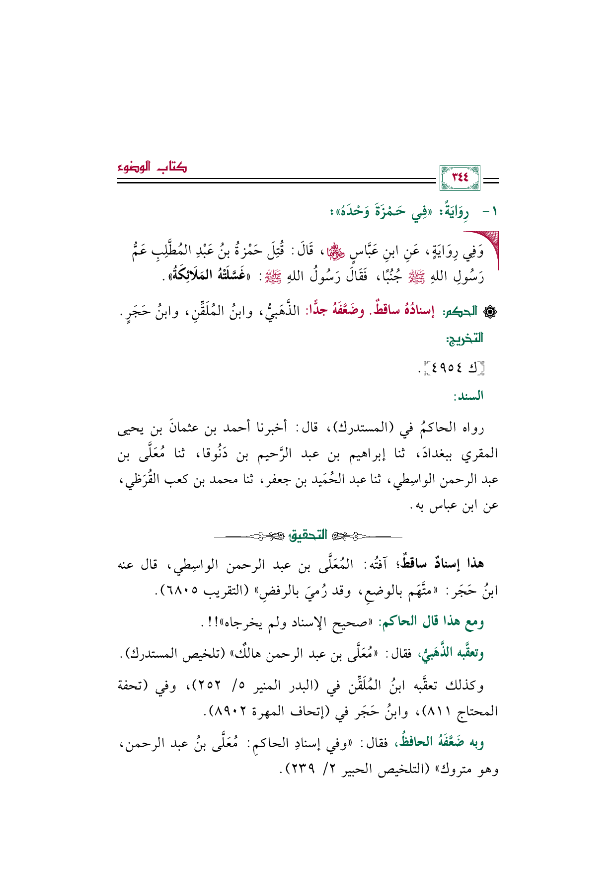 وبه ضَعَّفَهُ الحافظُ، فقال: "وفي إسنادِ الحاكمِ: مُعَلَّى بنُ عبد الرحمن، وهو متروك" (التلخيص الحبير ٢/ ٢٣٩).