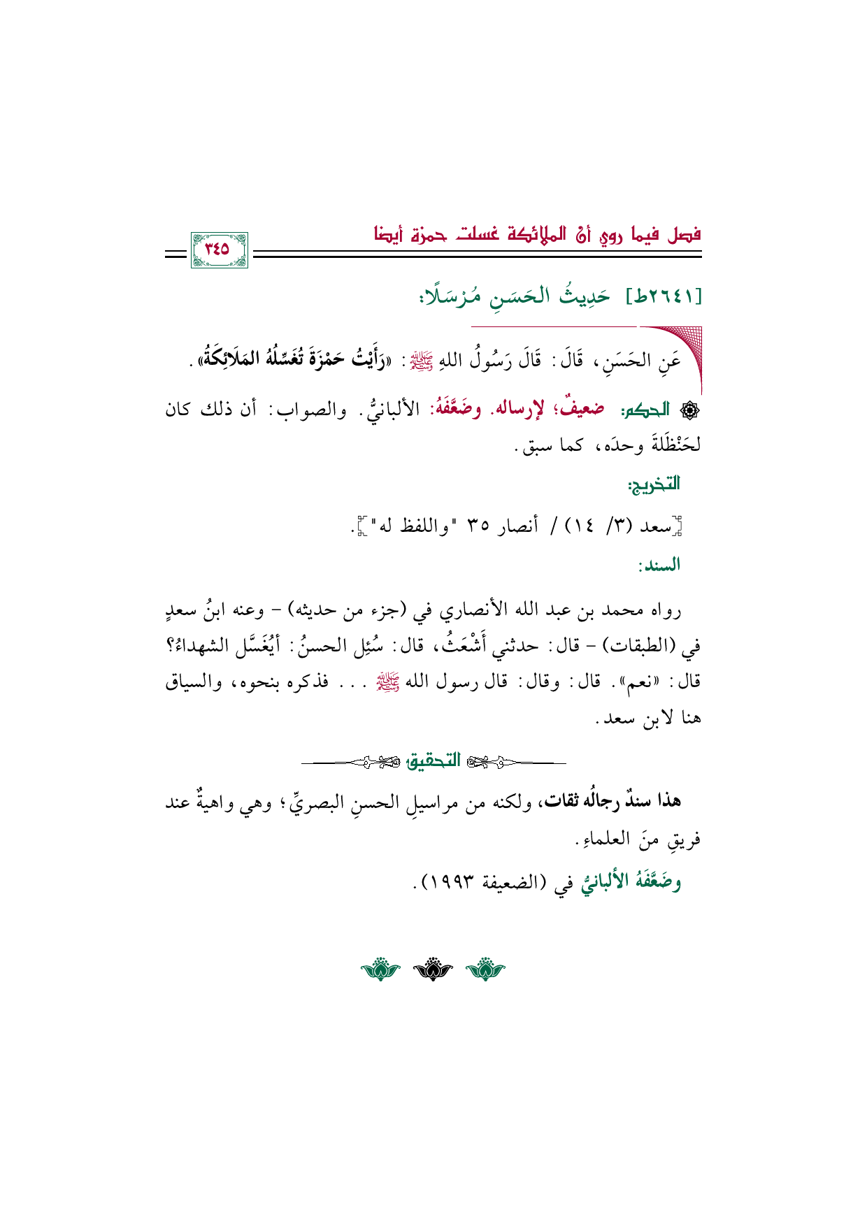 ◼ عَنِ الحَسَنِ، قَالَ: قَالَ رَسُولُ اللهِ صلى الله عليه وسلم: ((رَأَيْتُ حَمْزَةَ تُغَسِّلُهُ المَلَائِكَةُ)).