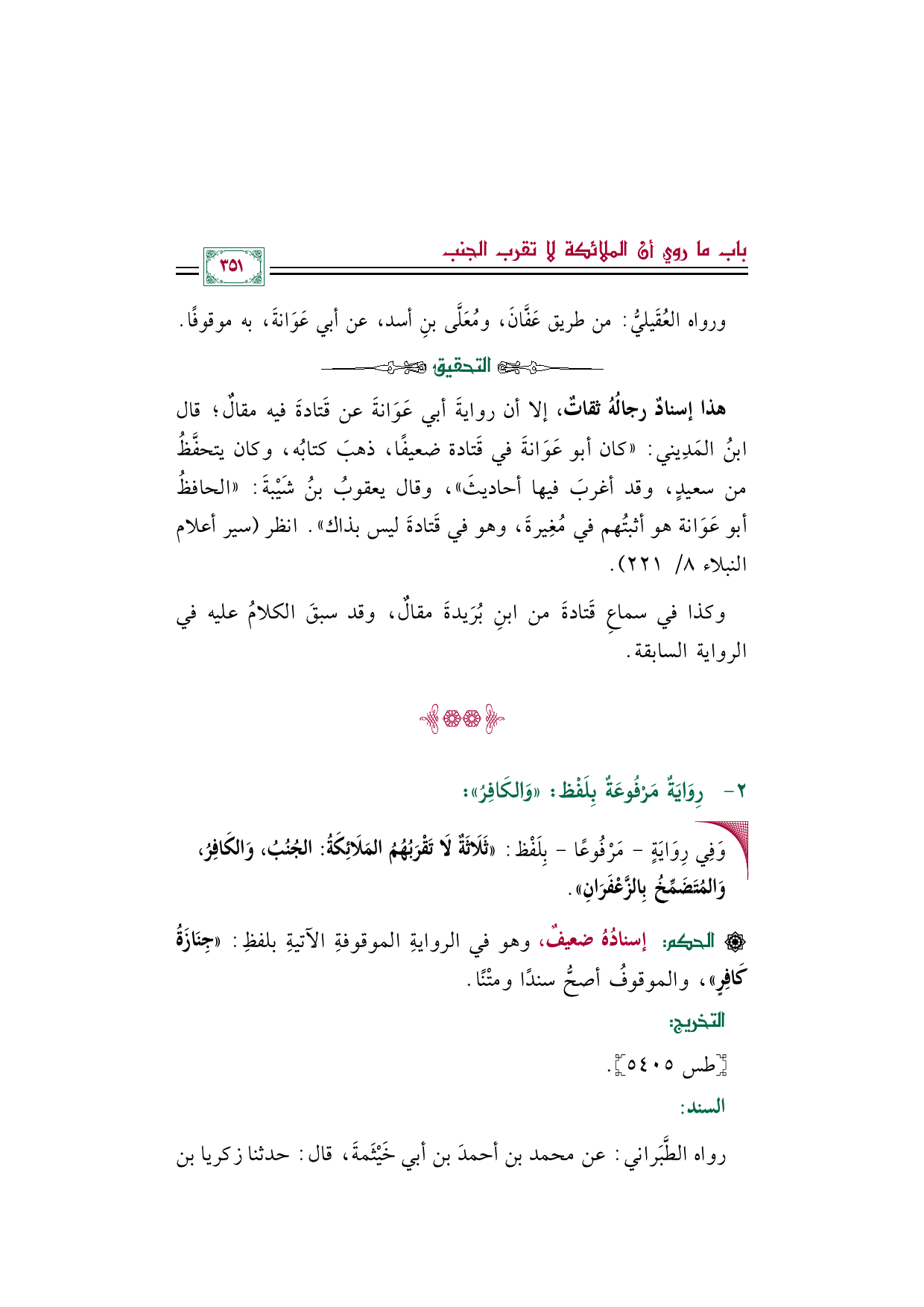 هذا إسنادٌ رجالُهُ ثقاتٌ، إلا أن روايةَ أبي عَوَانةَ عن قَتادةَ فيه مقالٌ؛ قال ابنُ المَدِيني: "كان أبو عَوَانةَ في قَتادة ضعيفًا، ذهبَ كتابُه، وكان يتحفَّظُ من سعيدٍ، وقد أغربَ فيها أحاديثَ"، وقال يعقوبُ بنُ شَيْبةَ: "الحافظُ أبو عَوَانة هو أثبتُهم في مُغِيرةَ، وهو في قَتادةَ ليس بذاك". انظر (سير أعلام النبلاء ٨/ ٢٢١).
