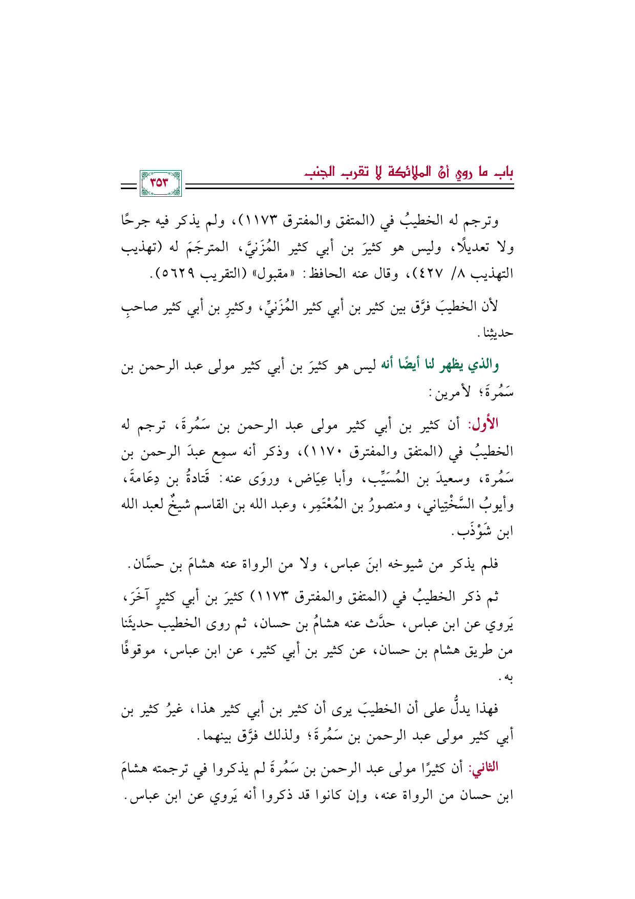الثاني: أن كثيرًا مولى عبد الرحمن بن سَمُرةَ لم يذكروا في ترجمته هشامَ بن حسان من الرواة عنه، وإن كانوا قد ذكروا أنه يَروي عن ابن عباس.