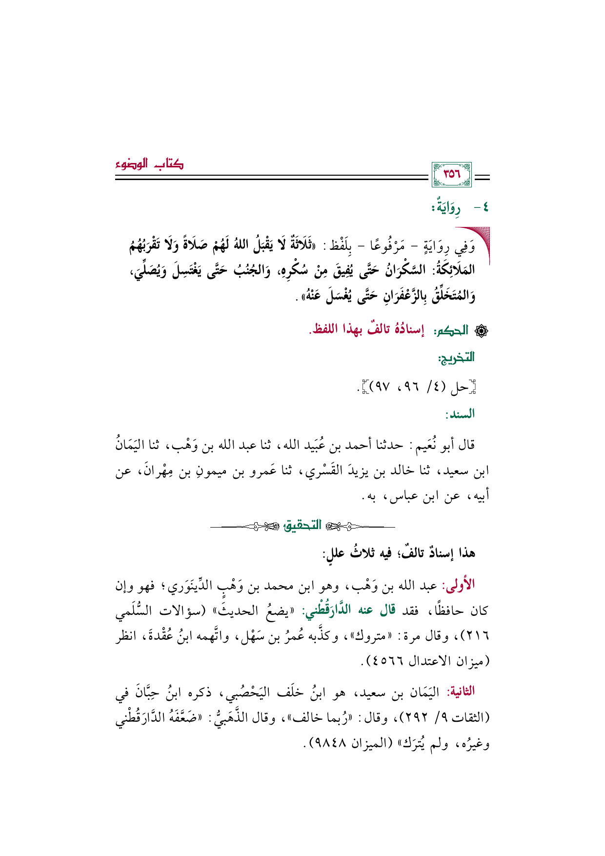 الأولى: عبد الله بن وَهْب، وهو ابن محمد بن وَهْبٍ الدِّينَوَري؛ فهو وإن كان حافظًا، فقد قال عنه الدَّارَقُطْني: "يضعُ الحديثَ" (سؤالات السُّلَمي ٢١٦)، وقال مرة: "متروك"، وكذَّبه عُمرُ بن سَهْل، واتَّهمه ابنُ عُقْدةَ، انظر (ميزان الاعتدال ٤٥٦٦).