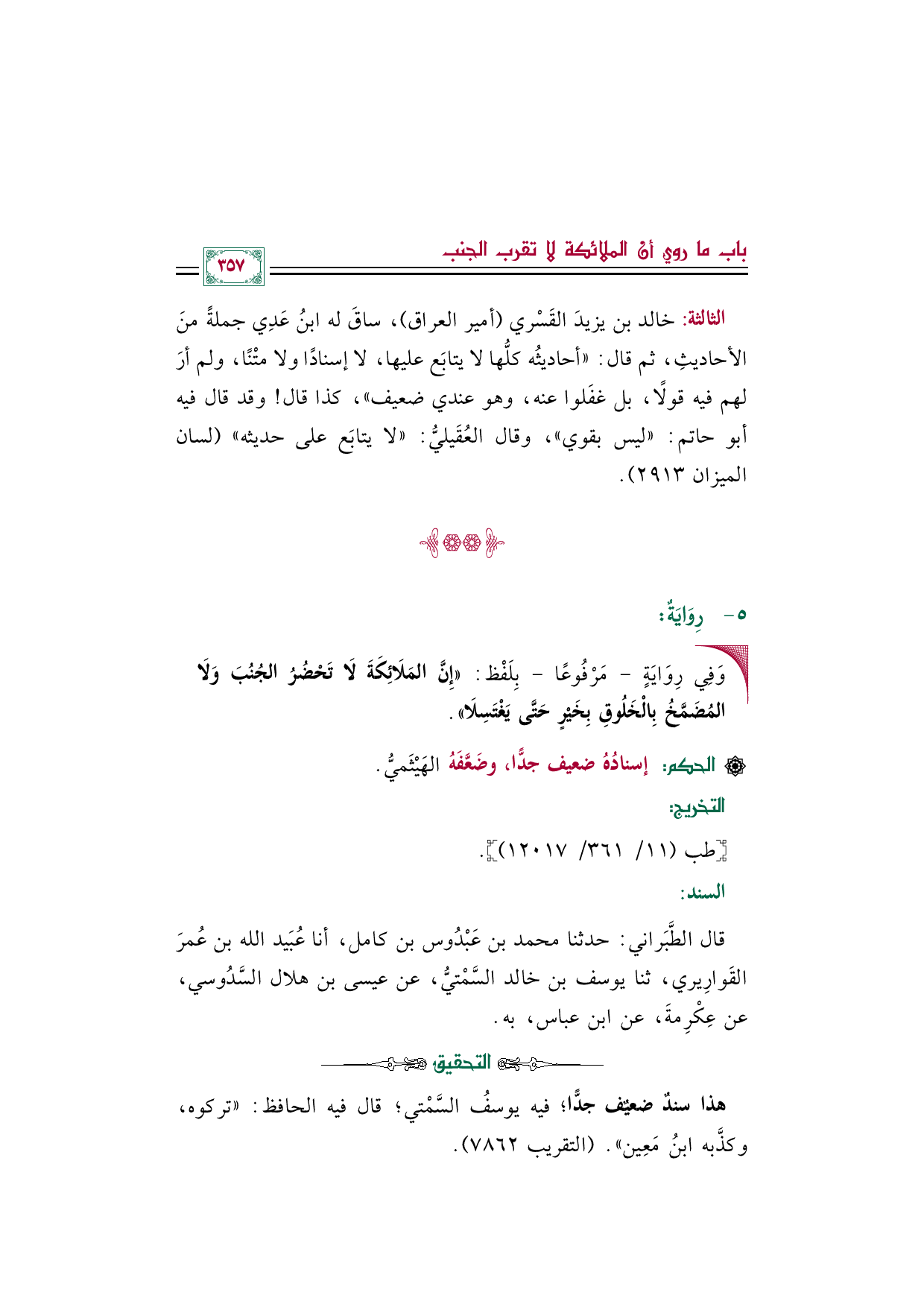 الثالثة: خالد بن يزيدَ القَسْري (أمير العراق)، ساقَ له ابنُ عَدِي جملةً منَ الأحاديثِ، ثم قال: "أحاديثُه كلُّها لا يتابَع عليها، لا إسنادًا ولا متْنًا، ولم أرَ لهم فيه قولًا، بل غفَلوا عنه، وهو عندي ضعيف"، كذا قال! وقد قال فيه أبو حاتم: "ليس بقوي"، وقال العُقَيليُّ: "لا يتابَع على حديثه" (لسان الميزان ٢٩١٣).