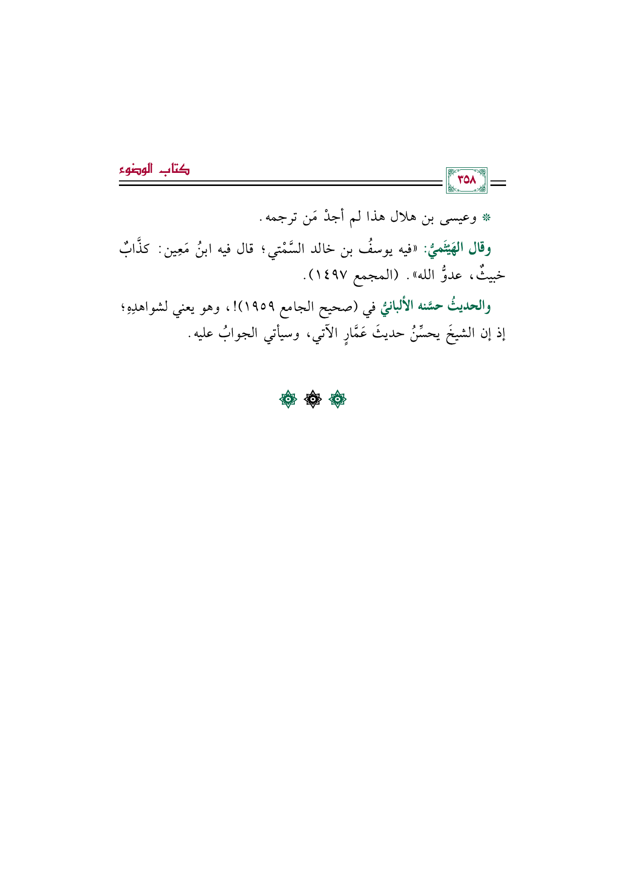 والحديثُ حسَّنه الألبانيُّ في (صحيح الجامع ١٩٥٩)!، وهو يعني لشواهدِهِ؛ إذ إن الشيخَ يحسِّنُ حديثَ عَمَّارٍ الآتي، وسيأتي الجوابُ عليه.