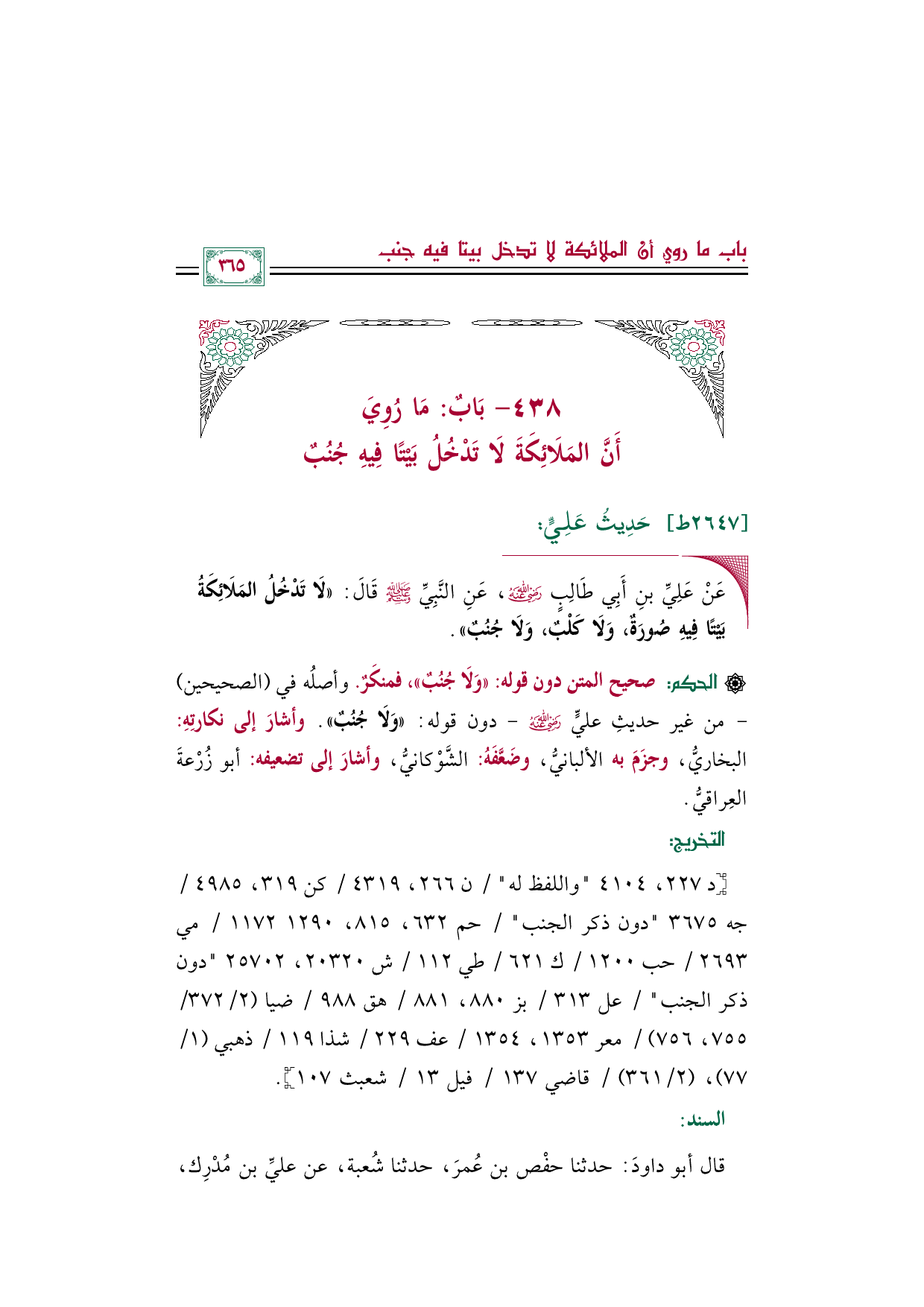 ◼ عَنْ عَلِيِّ بنِ أَبِي طَالِبٍ رضي الله عنه، عَنِ النَّبِيِّ صلى الله عليه وسلم قَالَ: ((لَا تَدْخُلُ المَلَائِكَةُ بَيْتًا فِيهِ صُورَةٌ، وَلَا كَلْبٌ، وَلَا جُنُبٌ)).