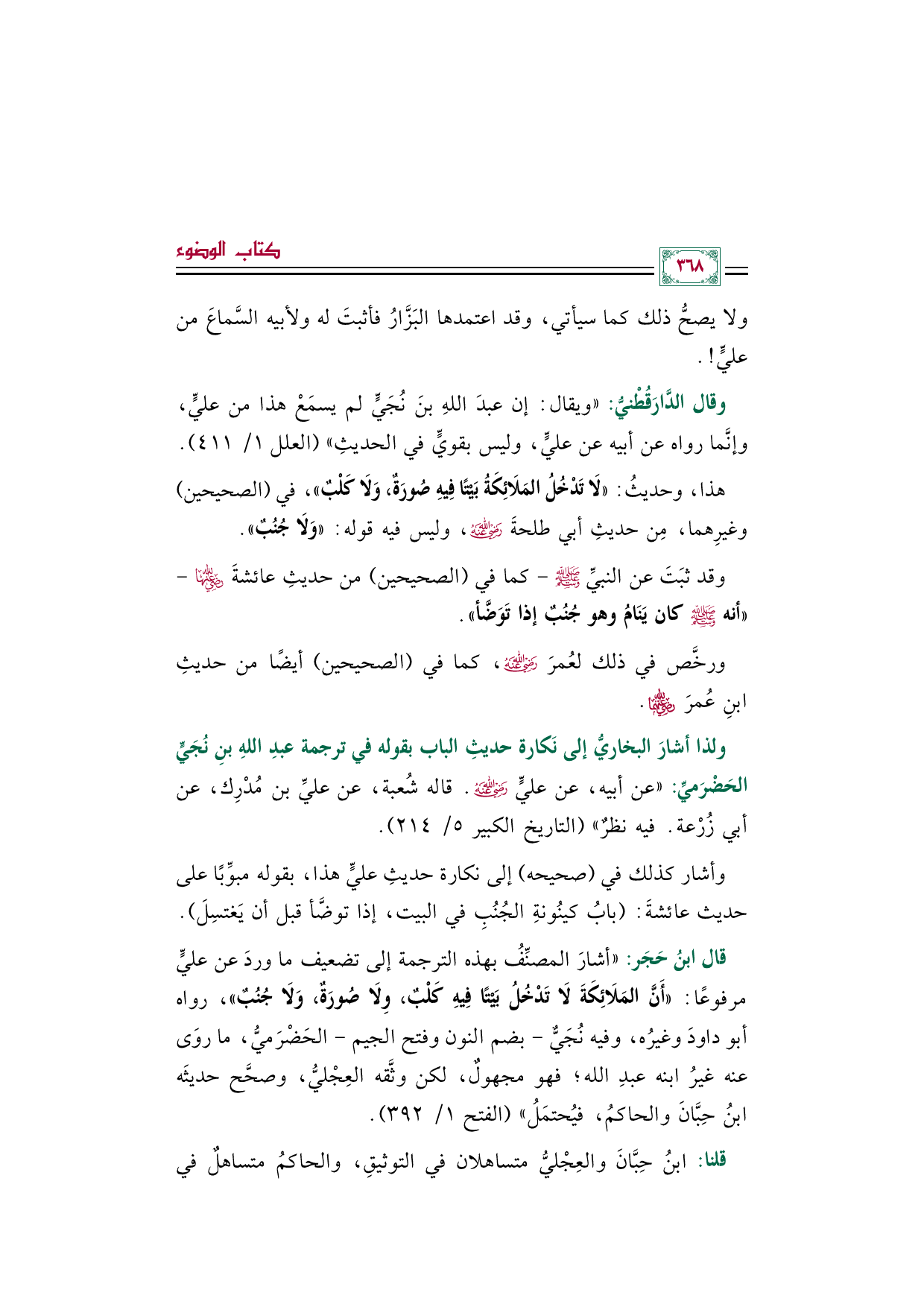 قال ابنُ حَجَر: "أشارَ المصنِّفُ بهذه الترجمة إلى تضعيف ما وردَ عن عليٍّ مرفوعًا: ((أَنَّ المَلَائِكَةَ لَا تَدْخُلُ بَيْتًا فِيهِ كَلْبٌ، وِلَا صُورَةٌ، وَلَا جُنُبٌ))، رواه أبو داودَ وغيرُه، وفيه نُجَيٌّ -بضم النون وفتح الجيم- الحَضْرَميُّ، ما روَى عنه غيرُ ابنه عبدِ الله؛ فهو مجهولٌ، لكن وثَّقه العِجْليُّ، وصحَّح حديثَه ابنُ حِبَّانَ والحاكمُ، فيُحتمَلُ" (الفتح ١/ ٣٩٢).
