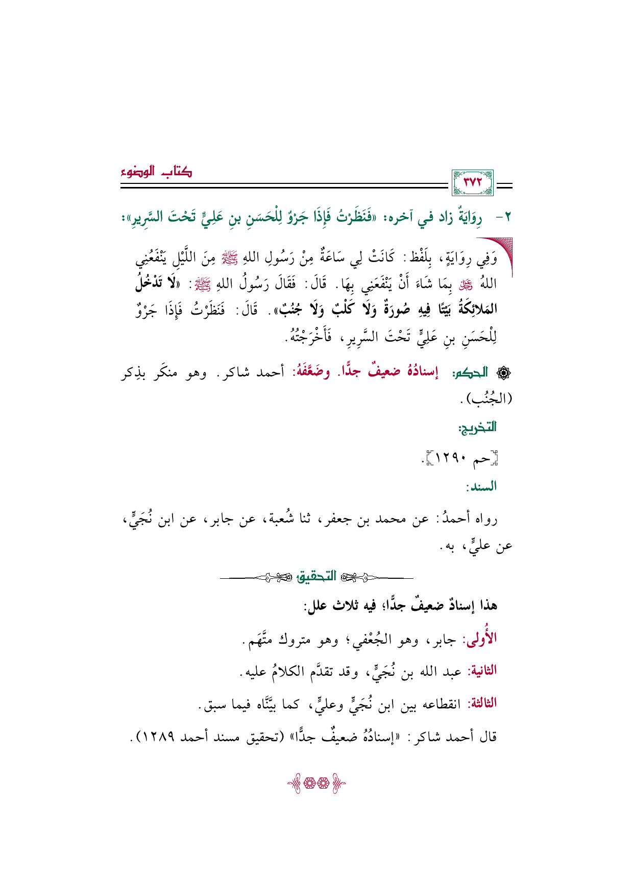 • وَفِي رِوَايَةٍ، بِلَفْظ: كَانَتْ لِي سَاعَةٌ مِنْ رَسُولِ اللهِ صلى الله عليه وسلم مِنَ اللَّيْلِ يَنْفَعُنِي اللهُ عَزَّ وَجَلَّ بِمَا شَاءَ أَنْ يَنْفَعَنِي بِهَا. قَالَ: فَقَالَ رَسُولُ اللهِ صلى الله عليه وسلم: ((لَا تَدْخُلُ المَلائِكَةُ بَيْتًا فِيهِ صُورَةٌ وَلَا كَلْبٌ وَلَا جُنُبٌ)). قَالَ: فَنَظَرْتُ فَإِذَا جَرْوٌ لِلْحَسَنِ بنِ عَلِيٍّ تَحْتَ السَّرِيرِ، فَأَخْرَجْتُهُ.
