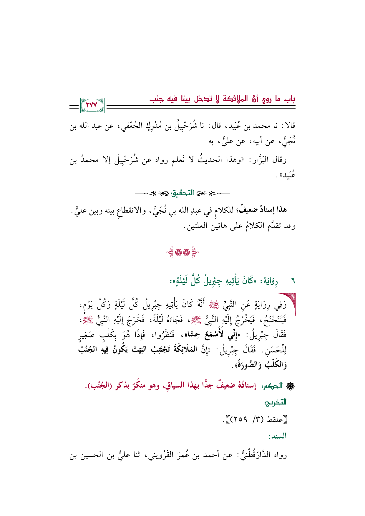 • وَفِي رِوَايَةٍ عَنِ النَّبِيِّ صلى الله عليه وسلم أَنَّهُ كَانَ يَأْتِيهِ جِبْرِيلُ كُلَّ لَيْلَةٍ وَكُلَّ يَوْمٍ، فَيَتَنَحْنَحُ، فَيَخْرُجُ إِلَيْهِ النَّبِيُّ صلى الله عليه وسلم، فَجَاءَهُ لَيْلَةً، فَخَرَجَ إِلَيْهِ النَّبِيُّ صلى الله عليه وسلم، فَقَالَ جِبْرِيلُ: ((إِنِّي لَأَسْمَعُ حِسًّا))، فَنَظَرُوا، فَإِذَا هُوَ بِكَلْبٍ صَغِيرٍ لِلْحَسَنِ. فَقَالَ جِبْرِيلُ: ((إِنَّ المَلَائِكَةَ تَجْتَنِبُ البَيْتَ يَكُونُ فِيهِ الجُنُبُ وَالكَلْبُ وَالصُّورَةُ)).