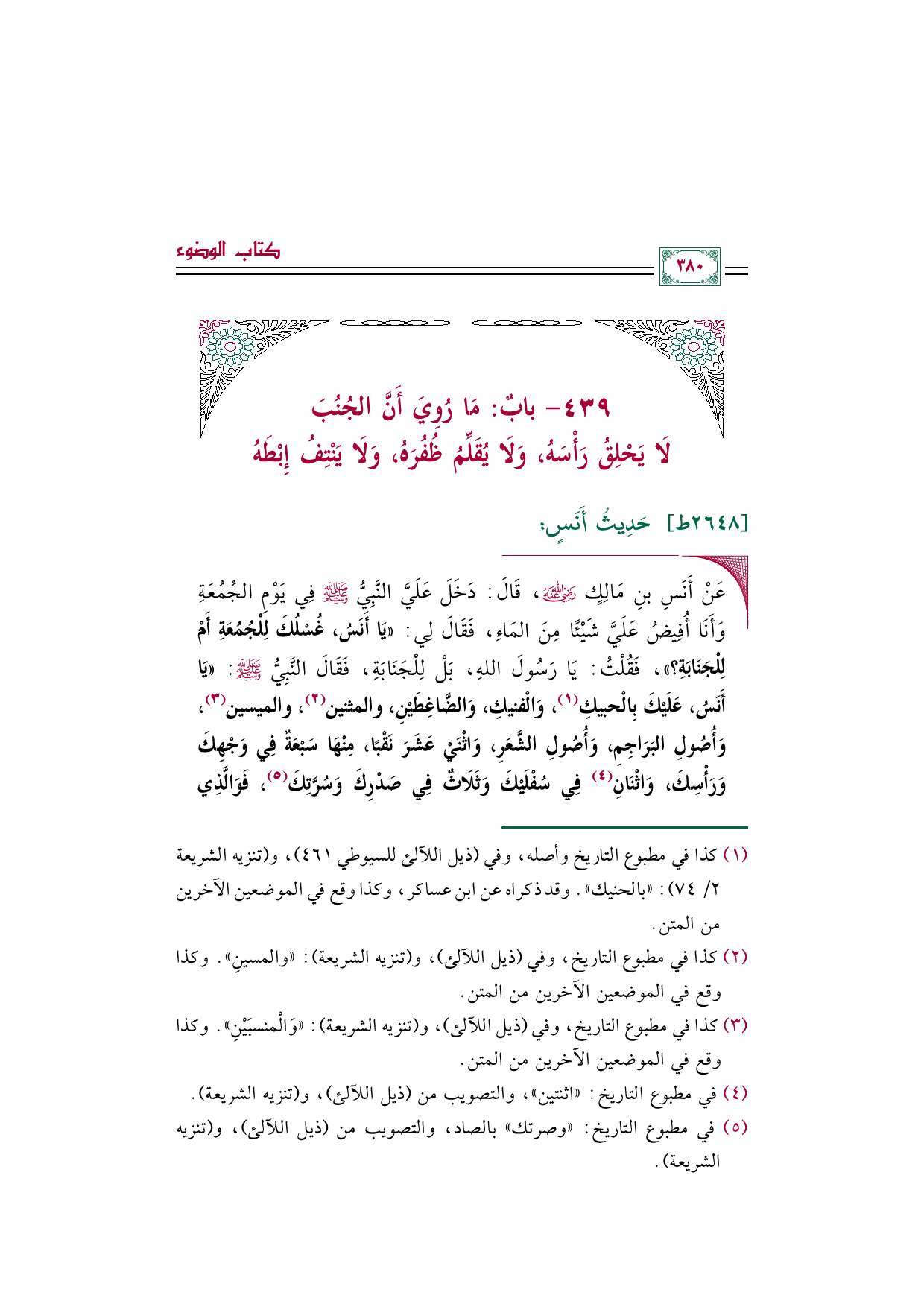 ◼ عَنْ أَنَسِ بنِ مَالِكٍ رضي الله عنه، قَالَ: دَخَلَ عَلَيَّ النَّبِيُّ صلى الله عليه وسلم فِي يَوْمِ الجُمُعَةِ وَأَنَا أُفِيضُ عَلَيَّ شَيْئًا مِنَ المَاءِ، فَقَالَ لِي: ((يَا أَنَسُ، غُسْلُكَ لِلْجُمُعَةِ أَمْ لِلْجَنَابَةِ؟ ))، فَقُلْتُ: يَا رَسُولَ اللهِ، بَلْ لِلْجَنَابَةِ، فَقَالَ النَّبِيُّ صلى الله عليه وسلم: ((يَا أَنَسُ، عَلَيْكَ بِالْحبيكِ (¬١)، وَالْفنيكِ، وَالضَّاغِطَيْنِ، والمثنين (¬٢)، والميسين (¬٣)، وَأُصُولِ البَرَاجِمِ، وَأُصُولِ الشَّعَرِ، وَاثْنَيْ عَشَرَ نَقْبًا، مِنْهَا سَبْعَةٌ فِي وَجْهِكَ وَرَأْسِكَ، وَاثْنَانِ (¬٤) فِي سُفْلَيْكَ وَثَلَاثٌ فِي صَدْرِكَ وَسُرَّتِكَ (¬٥)، فَوَالَّذِي