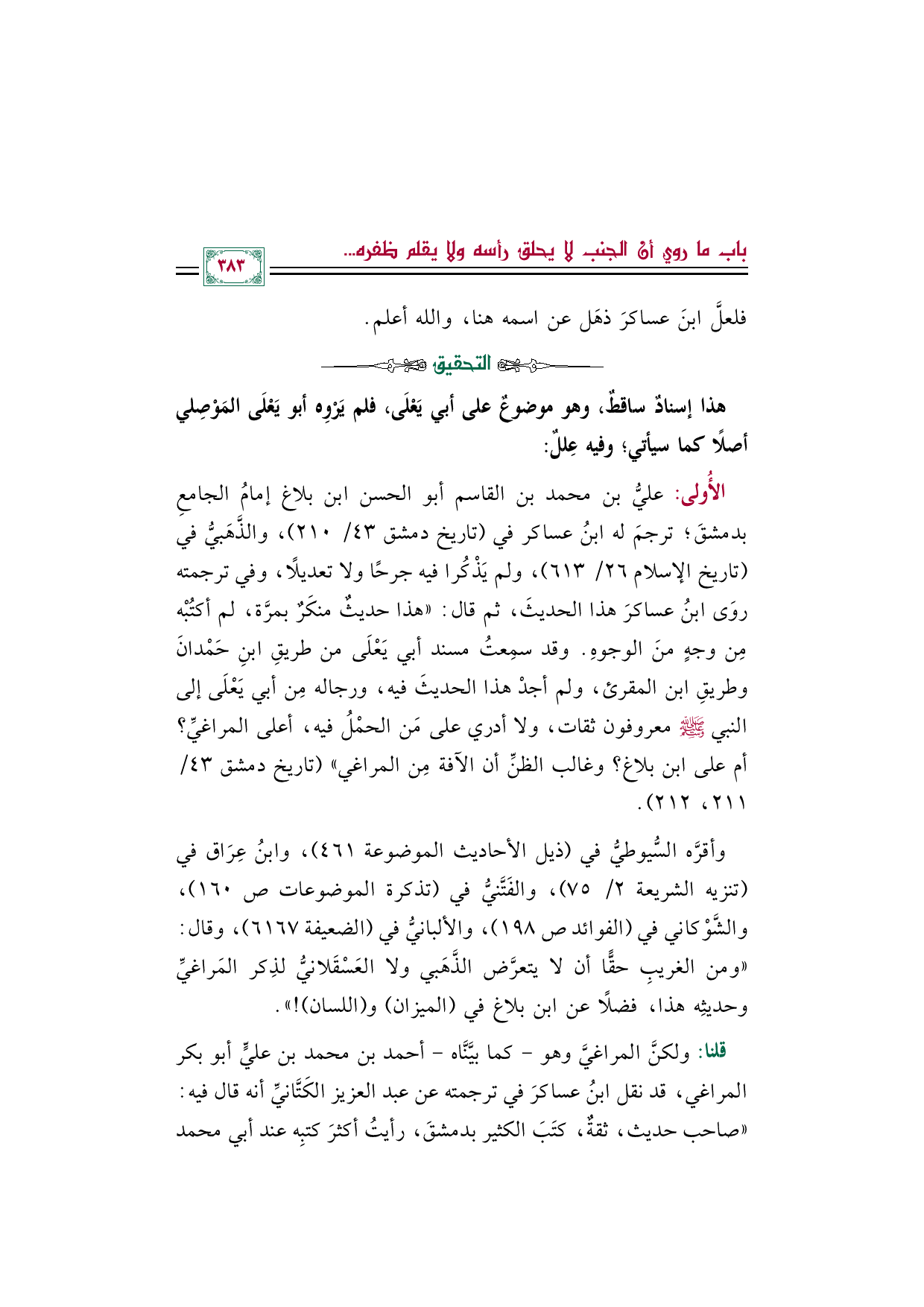 الأُولى: عليُّ بن محمد بن القاسم أبو الحسن ابن بلاغ إمامُ الجامعِ بدمشقَ؛ ترجمَ له ابنُ عساكر في (تاريخ دمشق ٤٣/ ٢١٠)، والذَّهَبيُّ في (تاريخ الإسلام ٢٦/ ٦١٣)، ولم يَذْكُرا فيه جرحًا ولا تعديلًا، وفي ترجمته روَى ابنُ عساكرَ هذا الحديثَ، ثم قال: "هذا حديثٌ منكَرٌ بمرَّة، لم أكتُبْه مِن وجهٍ منَ الوجوهِ. وقد سمِعتُ مسند أبي يَعْلَى من طريقِ ابنِ حَمْدانَ وطريقِ ابن المقرئ، ولم أجدْ هذا الحديثَ فيه، ورجاله مِن أبي يَعْلَى إلى النبي صلى الله عليه وسلم معروفون ثقات، ولا أدري على مَن الحمْلُ فيه، أعلى المراغيِّ؟ أم على ابن بلاغ؟ وغالب الظنِّ أن الآفة مِن المراغي" (تاريخ دمشق ٤٣/ ٢١١، ٢١٢).
