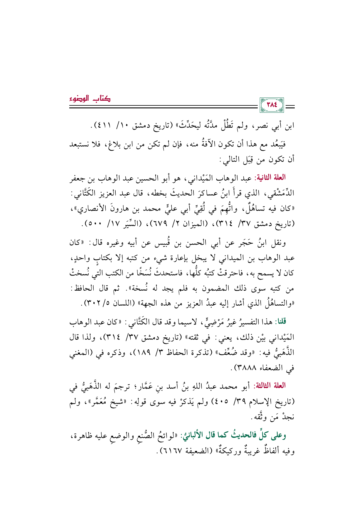 العلة الثانية: عبد الوهاب المَيْداني، هو أبو الحسين عبد الوهاب بن جعفر الدِّمَشْقي، الذي قرأَ ابنُ عساكرَ الحديثَ بخطه، قال عبد العزيز الكَتَّاني: "كان فيه تساهُلٌ، واتُّهِمَ في لُقِيِّ أبي عليٍّ محمد بن هارونَ الأنصاري"، (تاريخ دمشق ٣٧/ ٣١٤)، (الميزان ٢/ ٦٧٩)، (السِّيَر ١٧/ ٥٠٠).