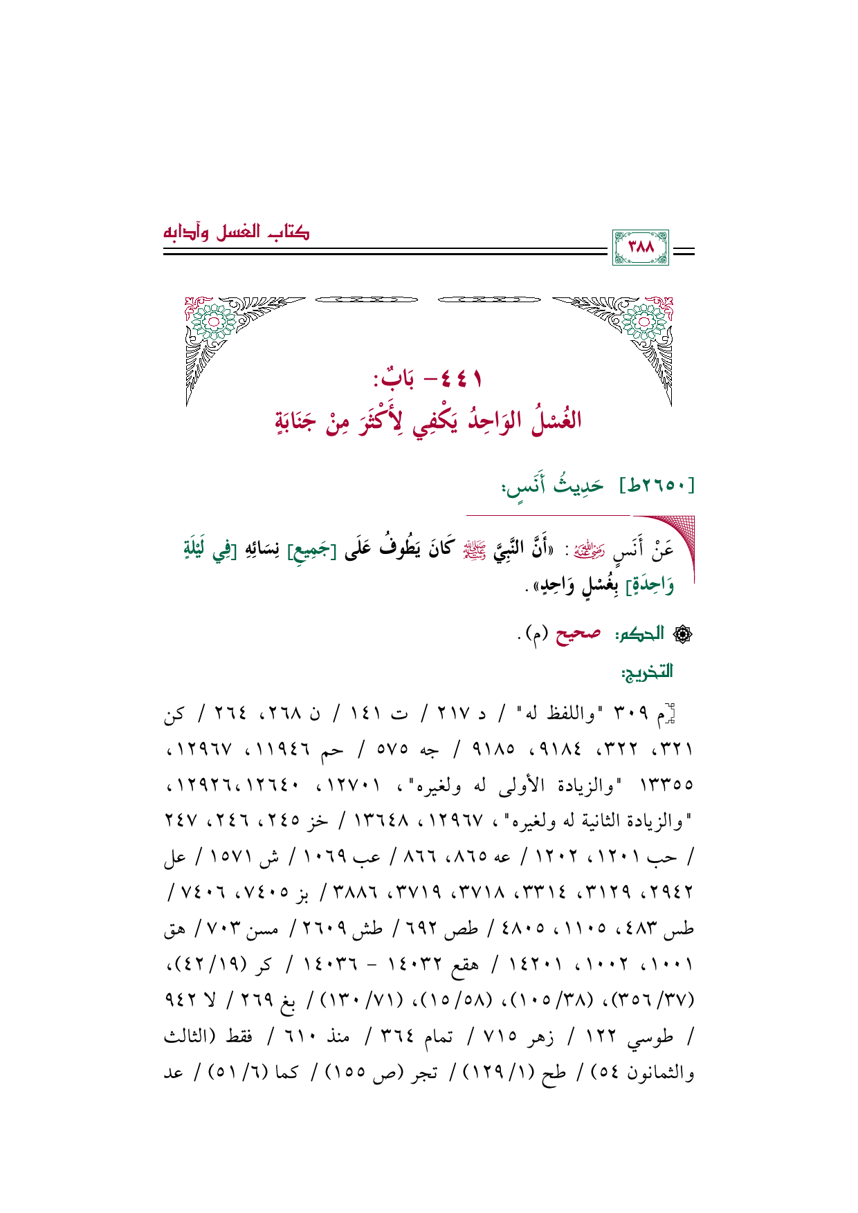 ◼ عَنْ أَنَسٍ رضي الله عنه: ((أَنَّ النَّبِيَّ صلى الله عليه وسلم كَانَ يَطُوفُ عَلَى [جَمِيعِ] نِسَائِهِ [فِي لَيْلَةٍ وَاحِدَةٍ] بِغُسْلٍ وَاحِدٍ)).