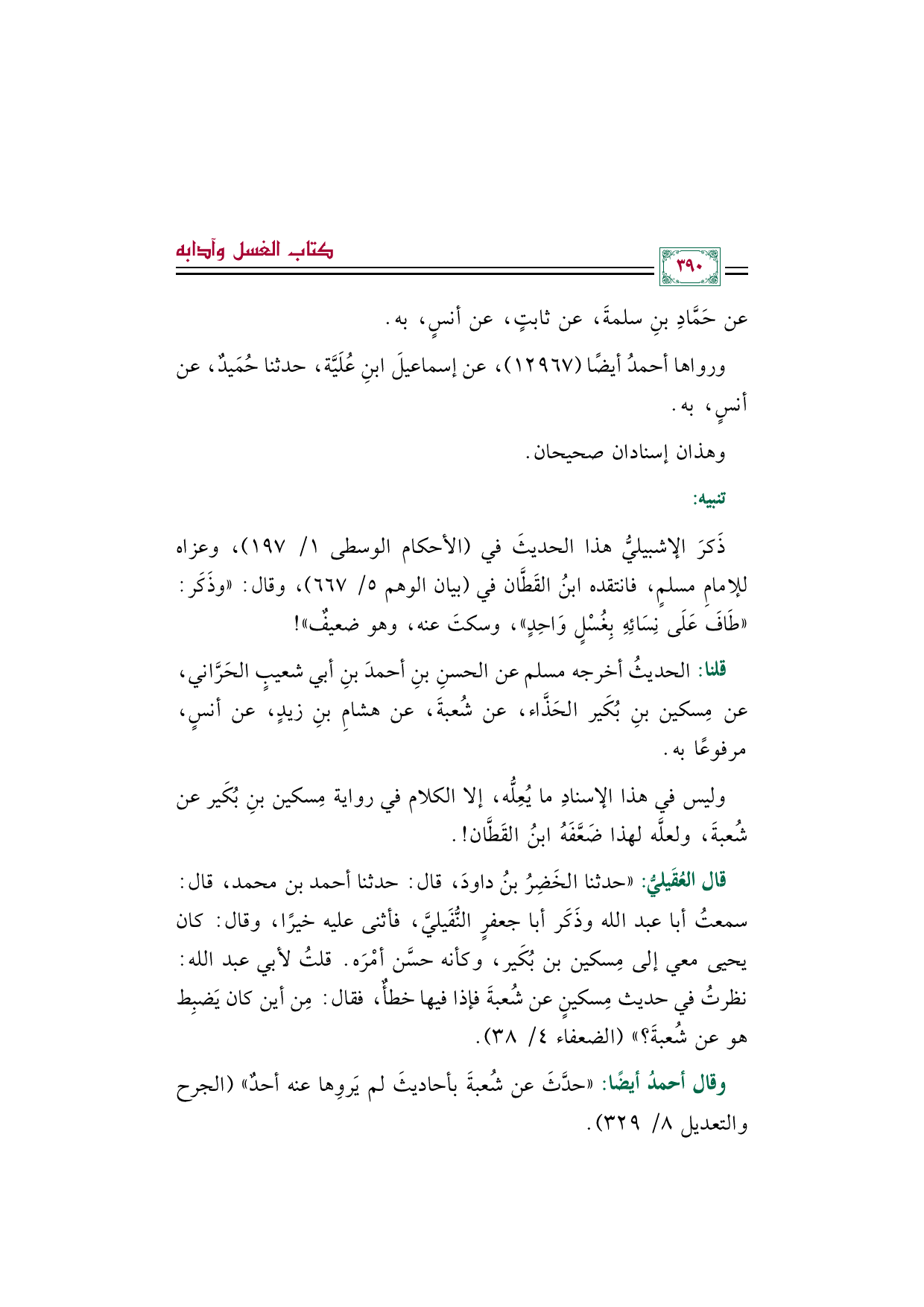 ذَكرَ الإشبيليُّ هذا الحديثَ في (الأحكام الوسطى ١/ ١٩٧)، وعزاه للإمامِ مسلمٍ، فانتقده ابنُ القَطَّان في (بيان الوهم ٥/ ٦٦٧)، وقال: "وذَكَر: ((طَافَ عَلَى نِسَائِهِ بِغُسْلٍ وَاحِدٍ))، وسكتَ عنه، وهو ضعيفٌ"!