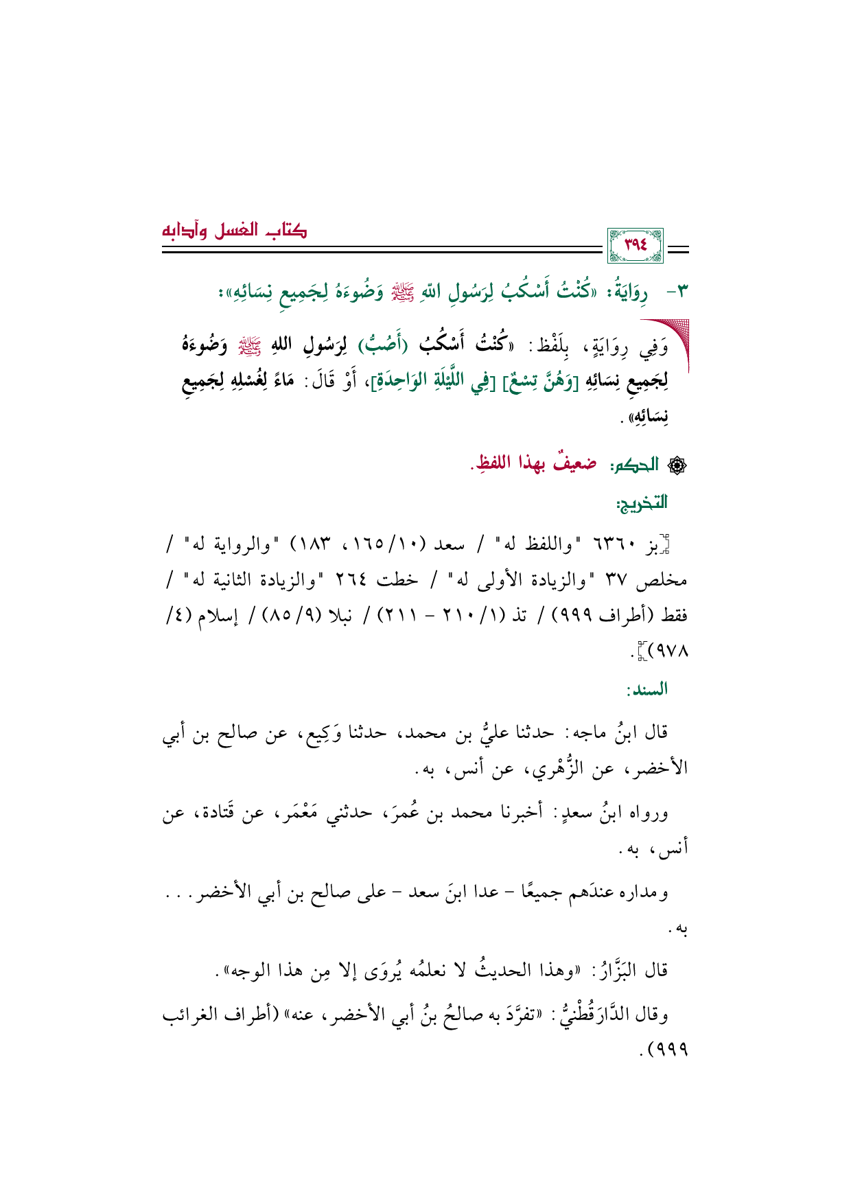 رِوَايَةُ ((((كُنْتُ أَسْكُبُ لِرَسُولِ اللهِ صلى الله عليه وسلم وَضُوءَهُ لِجَمِيعِ نِسَائِهِ)):