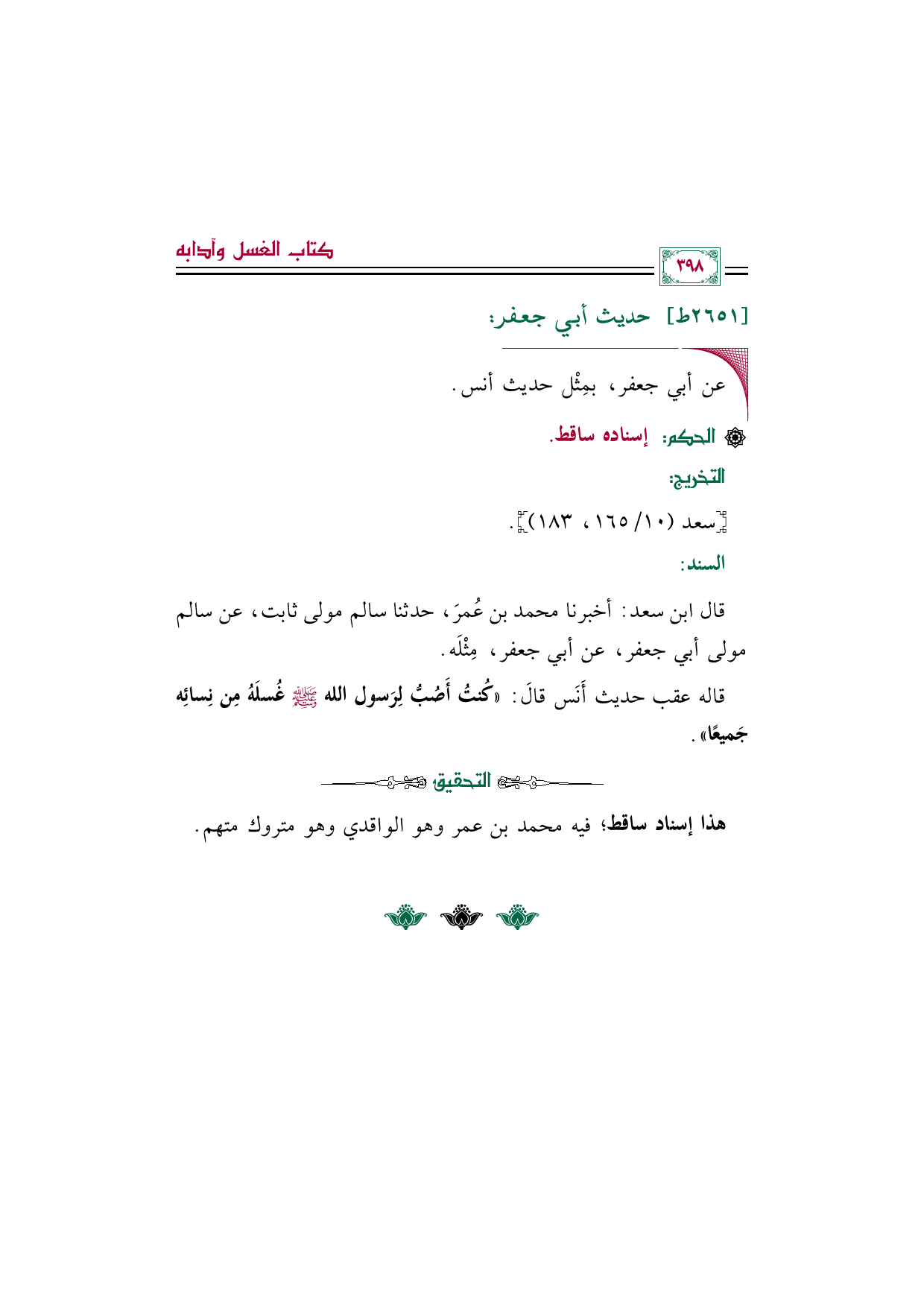 قال ابن سعد: أخبرنا محمد بن عُمرَ، حدثنا سالم مولى ثابت، عن سالم مولى أبي جعفر، عن أبي جعفر، مِثْلَه.