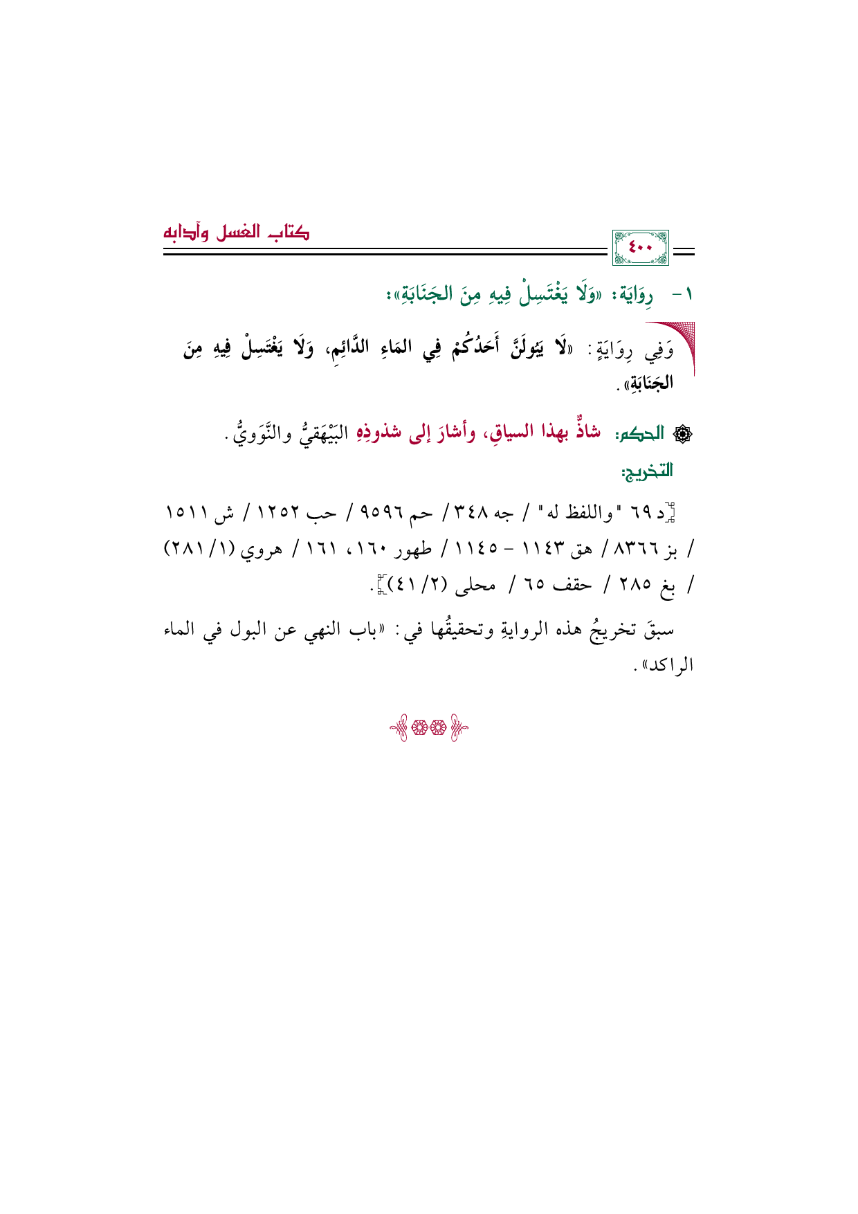 • وَفِي رِوَايَةٍ: ((لَا يَبُولَنَّ أَحَدُكُمْ فِي المَاءِ الدَّائِمِ، وَلَا يَغْتَسِلْ فِيهِ مِنَ الجَنَابَةِ)).
