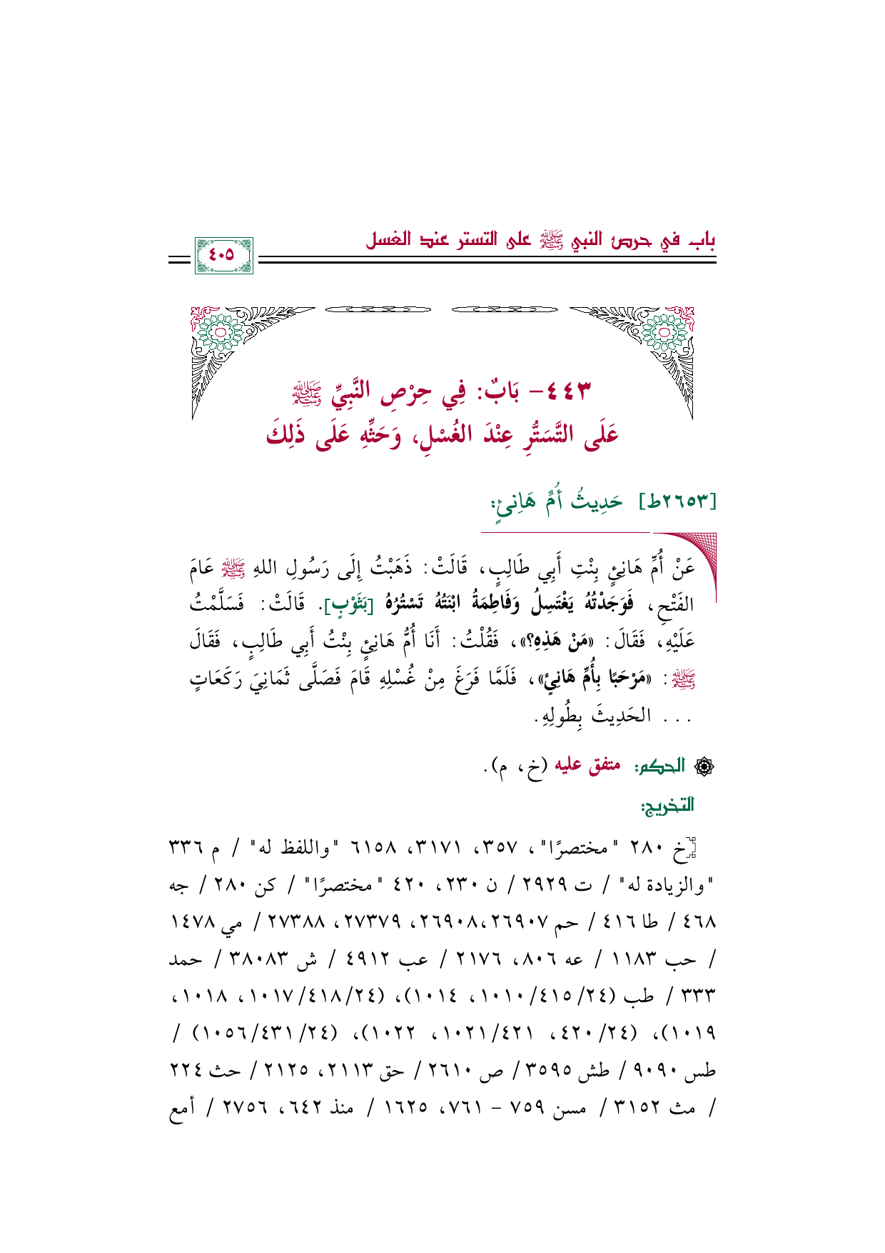 ◼ عَنْ أُمِّ هَانِئٍ بِنْتِ أَبِي طَالِبٍ، قَالَتْ: ذَهَبْتُ إِلَى رَسُولِ اللهِ صلى الله عليه وسلم عَامَ الفَتْحِ، فَوَجَدْتُهُ يَغْتَسِلُ وَفَاطِمَةُ ابْنَتُهُ تَسْتُرُهُ [بَثَوْبٍ]. قَالَتْ: فَسَلَّمْتُ عَلَيْهِ، فَقَالَ: ((مَنْ هَذِهِ؟ ))، فَقُلْتُ: أَنَا أُمُّ هَانِئٍ بِنْتُ أَبِي طَالِبٍ، فَقَالَ صلى الله عليه وسلم: ((مَرْحَبًا بِأُمِّ هَانِئٍ))، فَلَمَّا فَرَغَ مِنْ غُسْلِهِ قَامَ فَصَلَّى ثَمَانِيَ رَكَعَاتٍ ... الحَدِيثَ بِطُولِهِ.
