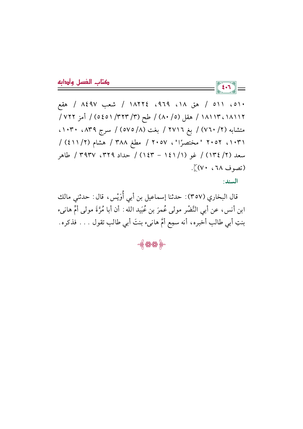 قال البخاري (٣٥٧): حدثنا إسماعيل بن أبي أُوَيْس، قال: حدثني مالك بن أنس، عن أبي النَّضْر مولى عُمرَ بن عُبَيد الله: أن أبا مُرَّةَ مولى أمِّ هانئ بنتِ أبي طالب أخبره، أنه سمِع أمَّ هانئ بنتَ أبي طالب تقول ... فذكره.
