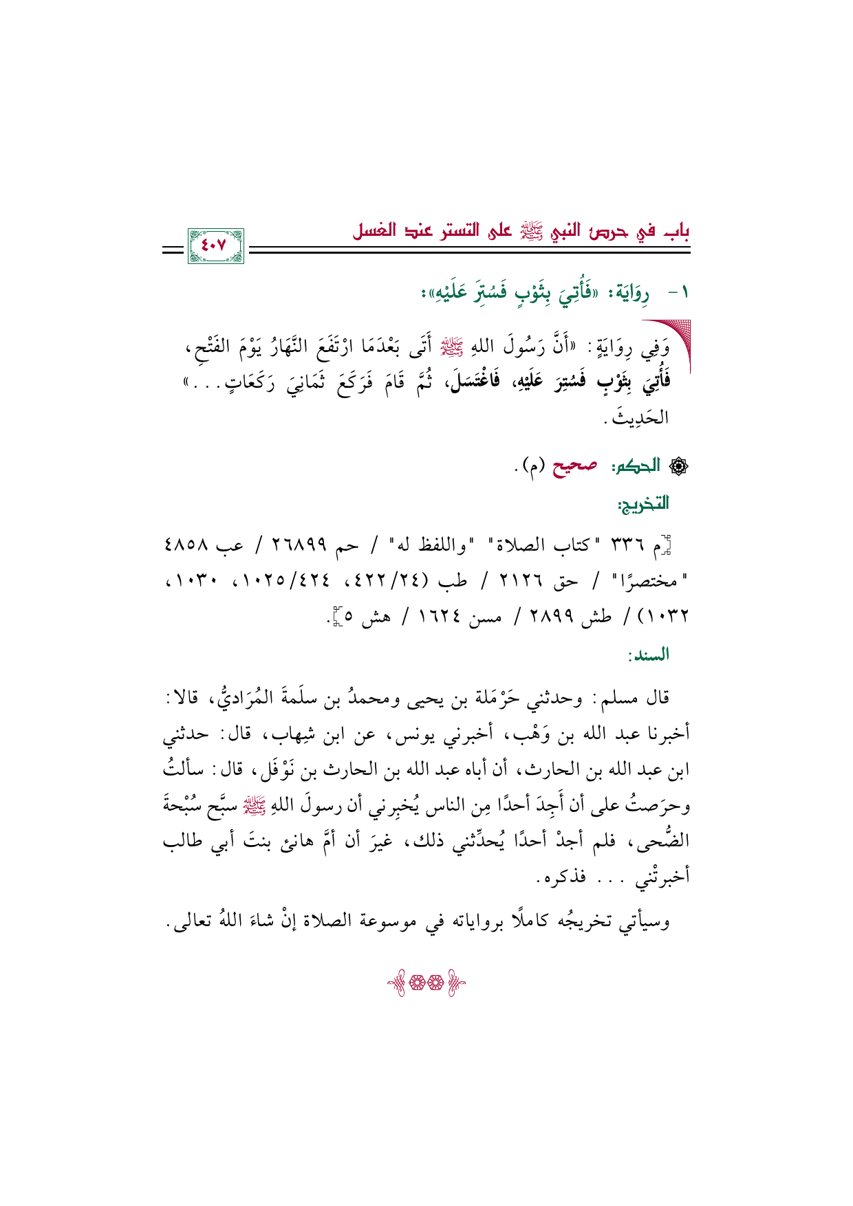 قال مسلم: وحدثني حَرْمَلة بن يحيى ومحمدُ بن سلَمةَ المُرَاديُّ، قالا: أخبرنا عبد الله بن وَهْب، أخبرني يونس، عن ابن شِهاب، قال: حدثني ابن عبد الله بن الحارث، أن أباه عبد الله بن الحارث بن نَوْفَل، قال: سألتُ وحرَصتُ على أن أَجِدَ أحدًا مِن الناس يُخبِرني أن رسولَ اللهِ صلى الله عليه وسلم سبَّح سُبْحةَ الضُّحى، فلم أجدْ أحدًا يُحدِّثني ذلك، غيرَ أن أمَّ هانئ بنتَ أبي طالب أخبرتْني ... فذكره.