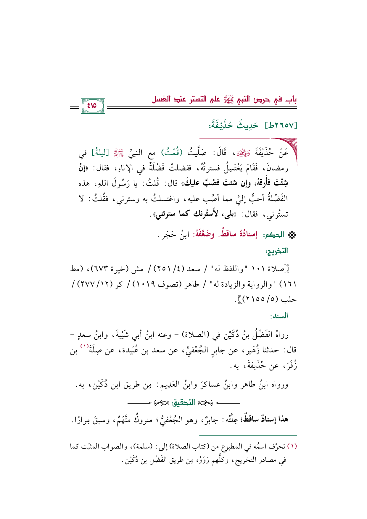 رواهُ الفَضْلُ بنُ دُكَيْن في (الصلاة) -وعنه ابنُ أبي شَيْبةَ، وابنُ سعدٍ- قال: حدثنا زُهَير، عن جابرٍ الجُعْفيِّ، عن سعد بن عُبَيدة، عن صِلَةَ (¬١) بن زُفَرَ، عن حُذَيفةَ، به.
