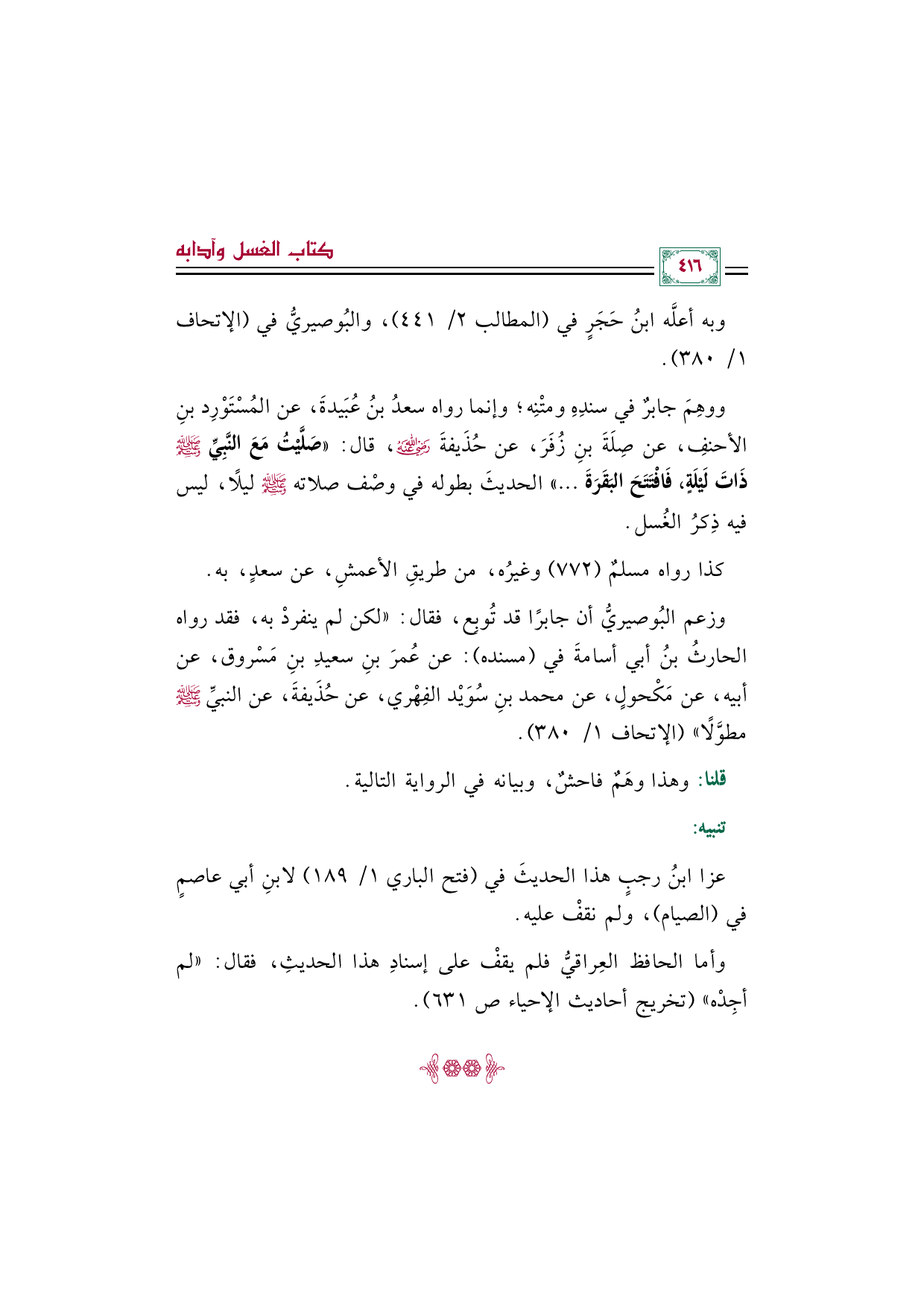 ووهِمَ جابرٌ في سندِهِ ومتْنِه؛ وإنما رواه سعدُ بنُ عُبَيدةَ، عن المُسْتَوْرِد بنِ الأحنفِ، عن صِلَةَ بنِ زُفَرَ، عن حُذَيفةَ رضي الله عنه، قال: ((صَلَّيْتُ مَعَ النَّبِيِّ صلى الله عليه وسلم ذَاتَ لَيْلَةٍ، فَافْتَتَحَ البَقَرَةَ ... )) الحديثَ بطوله في وصْف صلاته صلى الله عليه وسلم ليلًا، ليس فيه ذِكرُ الغُسل.