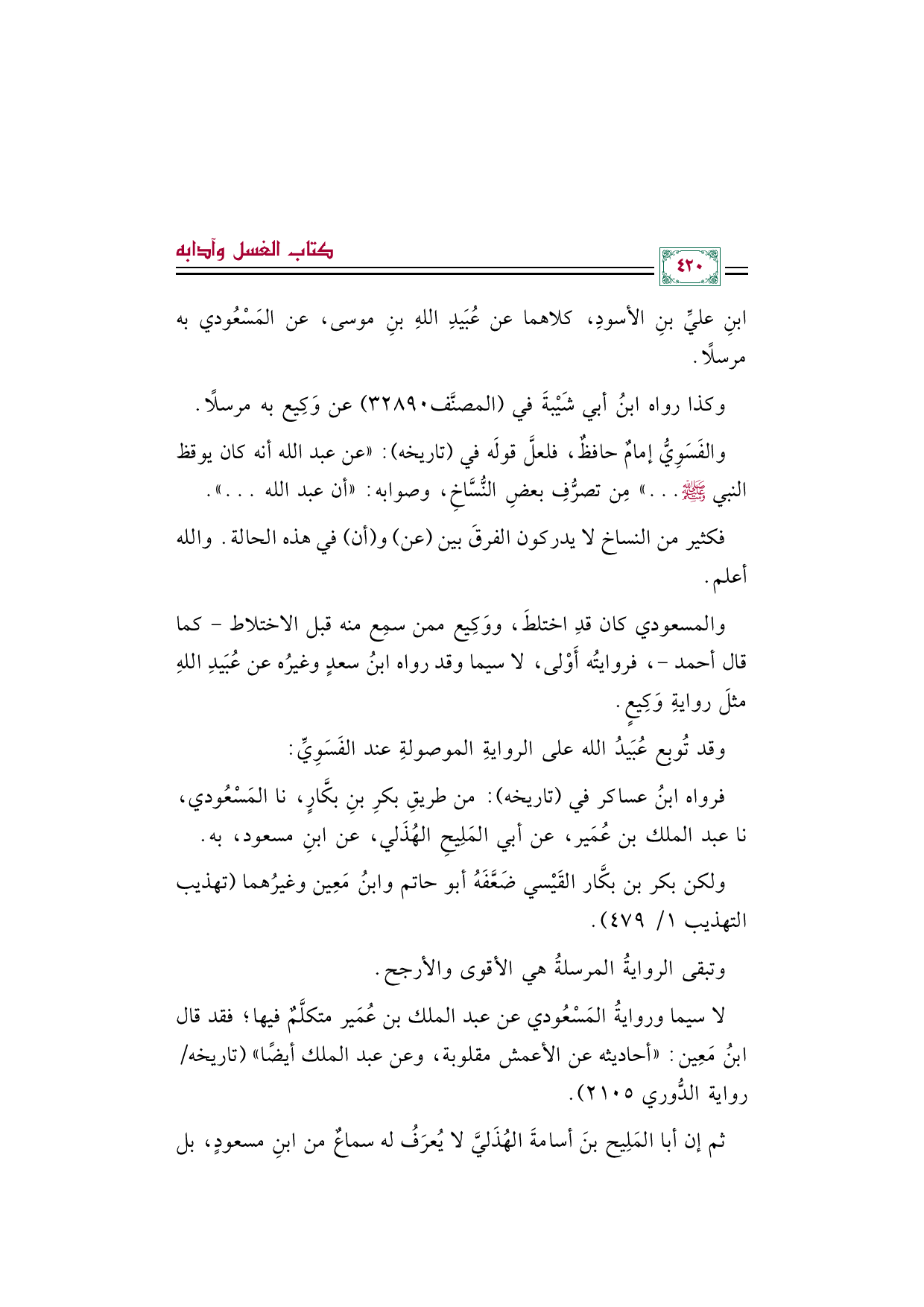 لا سيما وروايةُ المَسْعُودي عن عبد الملك بن عُمَير متكلَّمٌ فيها؛ فقد قال ابنُ مَعِين: "أحاديثه عن الأعمش مقلوبة، وعن عبد الملك أيضًا" (تاريخه/ رواية الدُّوري ٢١٠٥).