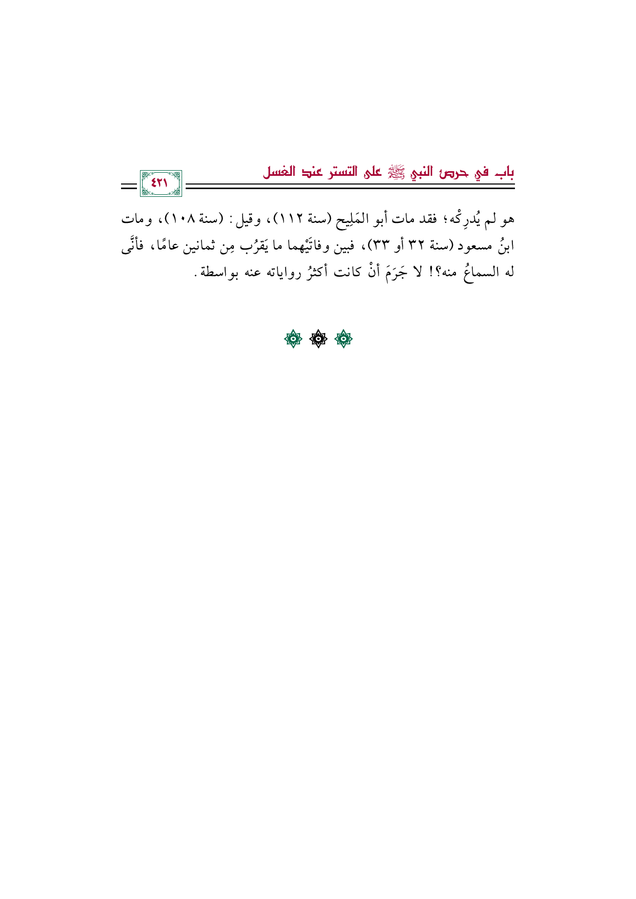 هو لم يُدرِكْه؛ فقد مات أبو المَلِيح (سنة ١١٢)، وقيل: (سنة ١٠٨)، ومات ابنُ مسعود (سنة ٣٢ أو ٣٣)، فبين وفاتَيْهما ما يَقرُب مِن ثمانين عامًا، فأنَّى له السماعُ منه؟! لا جَرَمَ أنْ كانت أكثرُ رواياته عنه بواسطة.