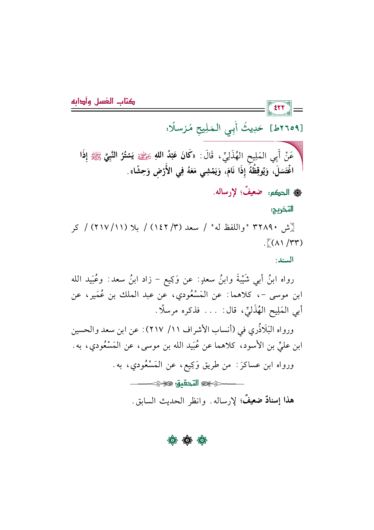 رواه ابنُ أبي شَيْبةَ وابنُ سعدٍ: عن وَكِيع -زاد ابنُ سعد: وعُبَيد الله بن موسى-، كلاهما: عن المَسْعُودي، عن عبد الملك بن عُمَير، عن أبي المَلِيح الهُذَليِّ، قال: ... فذكره مرسلًا.