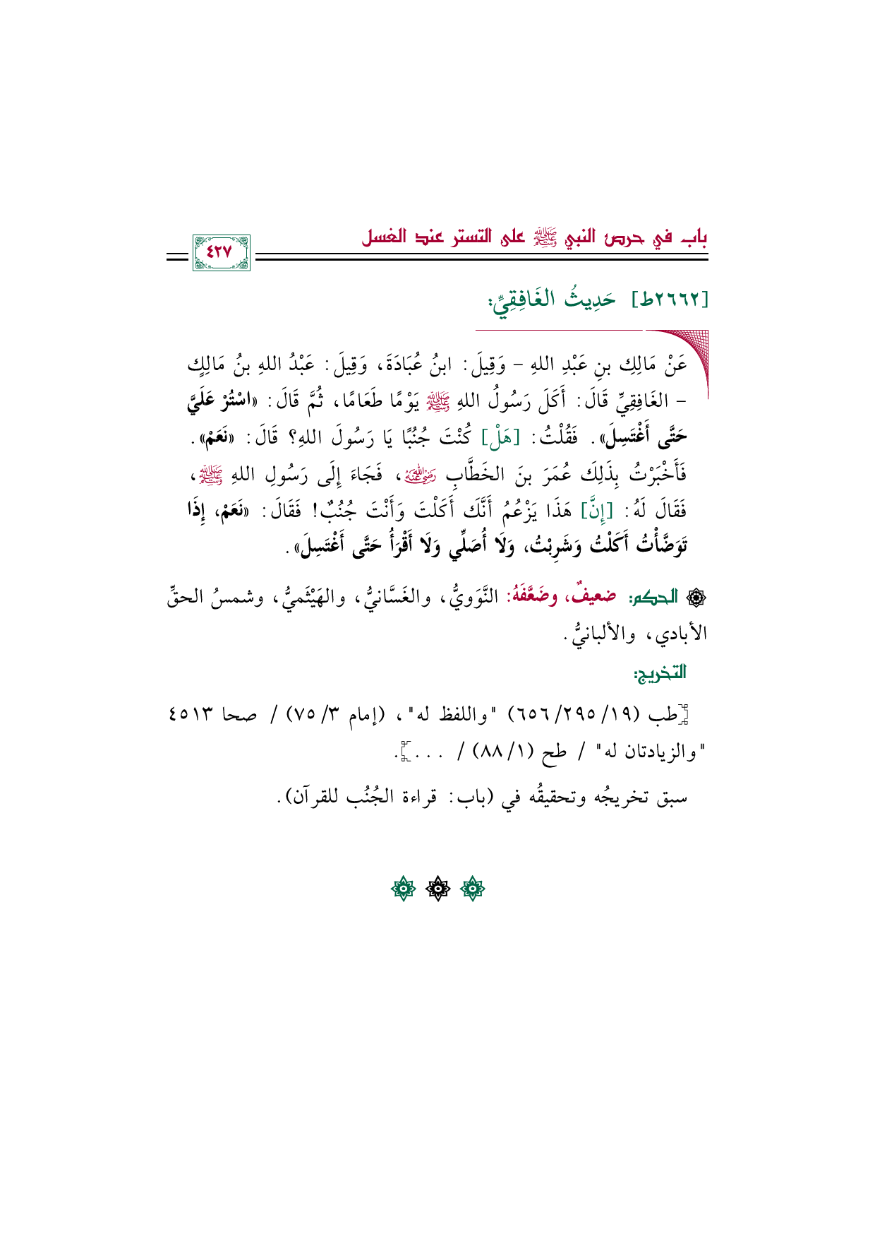 ◼ عَنْ مَالِكِ بنِ عَبْدِ اللهِ -وَقِيلَ: ابنُ عُبَادَةَ، وَقِيلَ: عَبْدُ اللهِ بنُ مَالِكٍ- الغَافِقِيِّ قَالَ: أَكَلَ رَسُولُ اللهِ صلى الله عليه وسلم يَوْمًا طَعَامًا، ثُمَّ قَالَ: ((اسْتُرْ عَلَيَّ حَتَّى أَغْتَسِلَ)). فَقُلْتُ: [هَلْ] كُنْتَ جُنُبًا يَا رَسُولَ اللهِ؟ قَالَ: ((نَعَمْ)). فَأَخْبَرْتُ بِذَلِكَ عُمَرَ بنَ الخَطَّابِ رضي الله عنه، فَجَاءَ إِلَى رَسُولِ اللهِ صلى الله عليه وسلم، فَقَالَ لَهُ: [إِنَّ] هَذَا يَزْعُمُ أَنَّكَ أَكَلْتَ وَأَنْتَ جُنُبٌ! فَقَالَ: ((نَعَمْ، إِذَا تَوَضَّأْتُ أَكَلْتُ وَشَرِبْتُ، وَلَا أُصَلِّي وَلَا أَقْرَأُ حَتَّى أَغْتَسِلَ)).