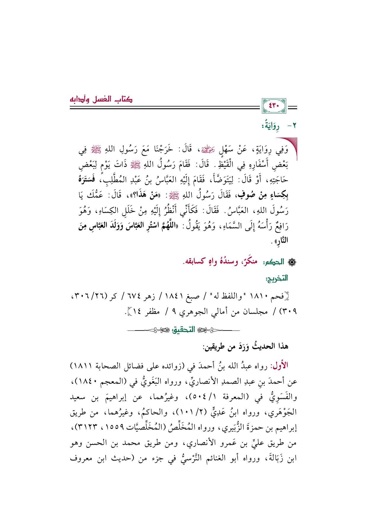 الأول: رواه عبدُ الله بنُ أحمدَ في (زوائده على فضائل الصحابة ١٨١١) عن أحمدَ بنِ عبدِ الصمدِ الأنصاريِّ، ورواه البَغَويُّ في (المعجم ١٨٤٠)، والفَسَوِيُّ في (المعرفة ١/ ٥٠٤)، وغيرُهما، عن إبراهيمَ بن سعيد الجَوْهَري، ورواه ابنُ عَدِيٍّ (٢/ ١٠١)، والحاكمُ، وغيرُهما، من طريق إبراهيم بن حمزةَ الزُّبَيري، ورواه المُخَلِّصُ (المُخَلِّصيَّات ١٥٥٩، ٣١٢٣)، من طريق عليِّ بن عَمرو الأنصاري، ومن طريق محمد بن الحسن وهو ابن زَبَالةَ، ورواه أبو الغنائم النَّرْسيُّ في جزء من (حديث ابن معروف