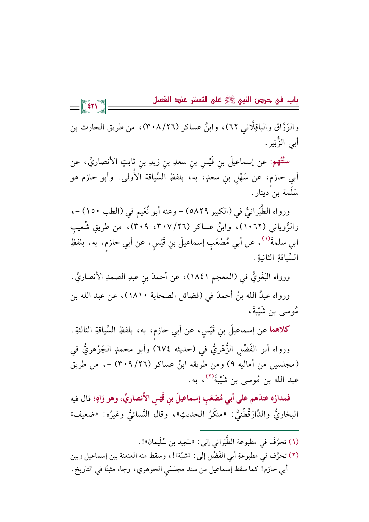 (¬٢) تحرَّف في مطبوعةِ أبي الفَضْل إلى: "شبّة"! ، وسقط منه العنعنة بين إسماعيل وبين أبي حازم! كما سقط إسماعيل من سند مجلسَيِ الجوهري، وجاء مثبتًا في التاريخ.