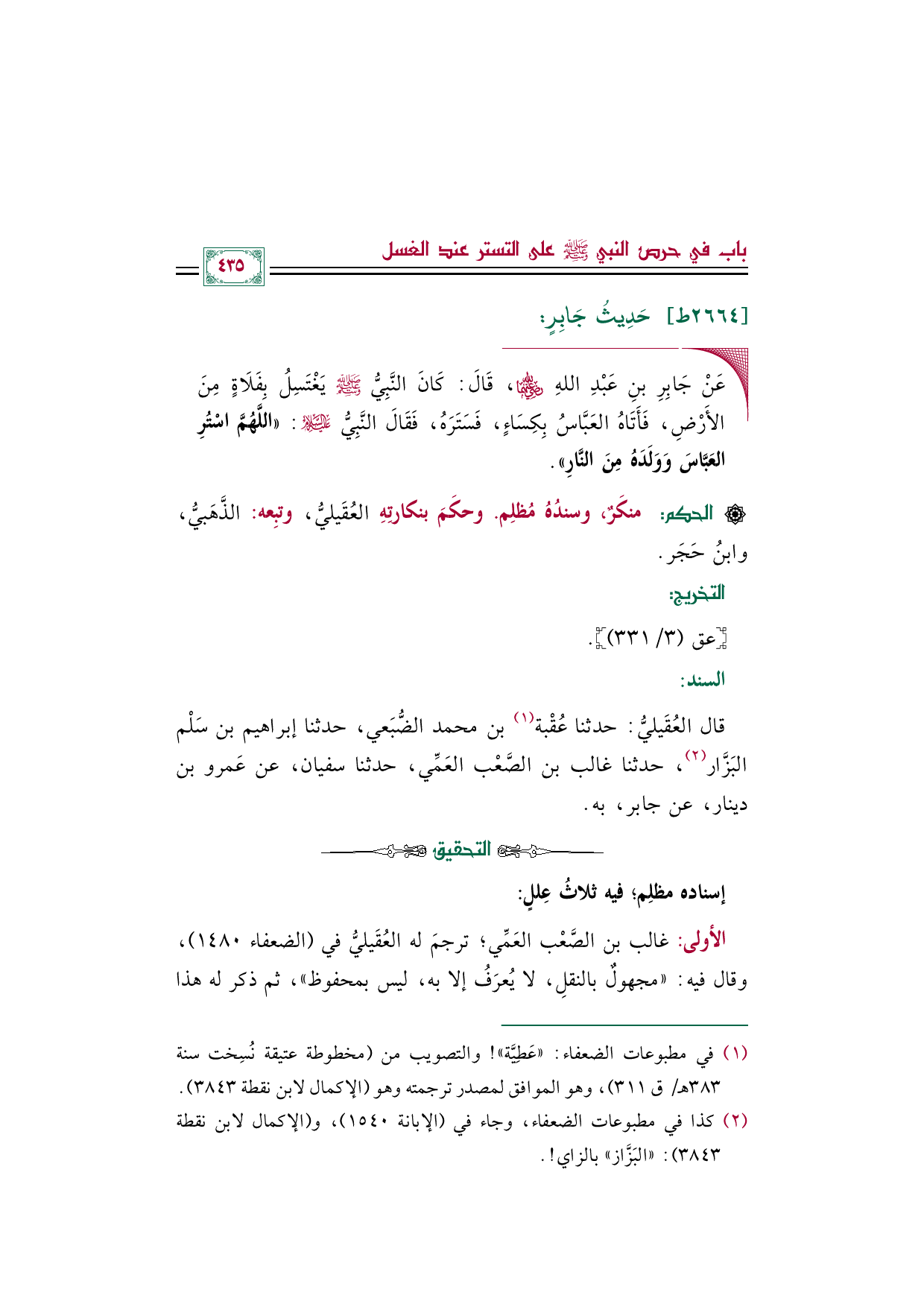 قال العُقَيليُّ: حدثنا عُقْبة (¬١) بن محمد الضُّبَعي، حدثنا إبراهيم بن سَلْم البَزَّار (¬٢)، حدثنا غالب بن الصَّعْب العَمِّي، حدثنا سفيان، عن عَمرو بن دينار، عن جابر، به.