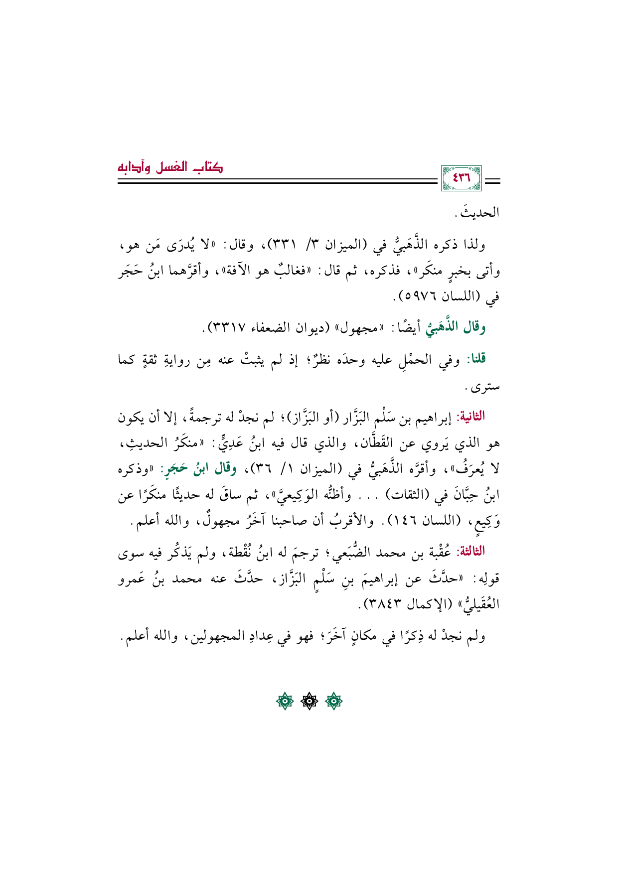 الثانية: إبراهيم بن سَلْم البَزَّار (أو البَزَّاز)؛ لم نجدْ له ترجمةً، إلا أن يكون هو الذي يَروي عن القَطَّان، والذي قال فيه ابنُ عَدِيٍّ: "منكَرُ الحديثِ، لا يُعرَفُ"، وأقرَّه الذَّهَبيُّ في (الميزان ١/ ٣٦)، وقال ابنُ حَجَرٍ: "وذكره ابنُ حِبَّانَ في (الثقات) ... وأظنُّه الوَكِيعيَّ"، ثم ساقَ له حديثًا منكَرًا عن وَكِيعٍ، (اللسان ١٤٦). والأقربُ أن صاحبنا آخَرُ مجهولٌ، والله أعلم.
