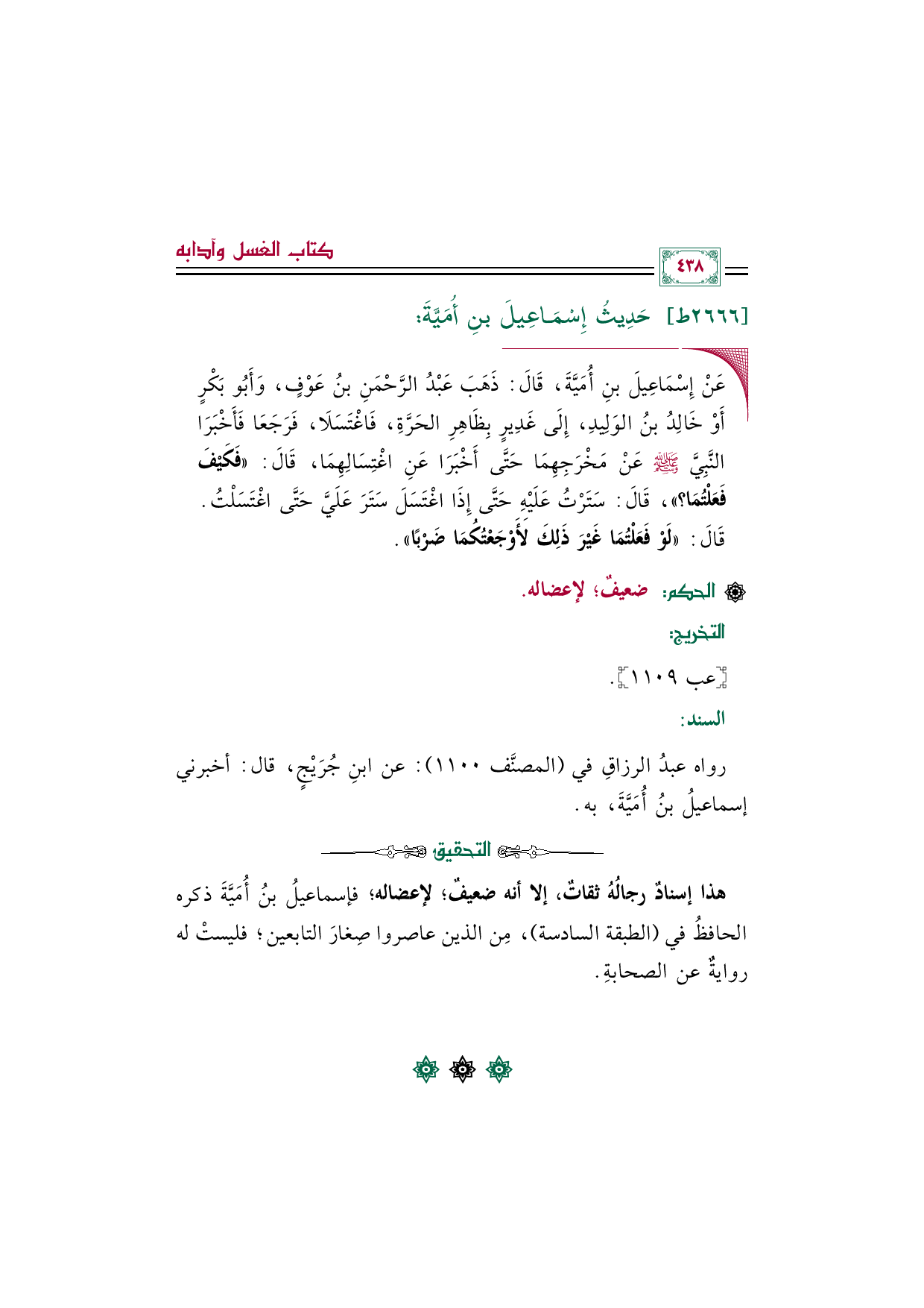 هذا إسنادٌ رجالُهُ ثقاتٌ، إلا أنه ضعيفٌ؛ لإعضاله؛ فإسماعيلُ بنُ أُمَيَّةَ ذكره الحافظُ في (الطبقة السادسة)، مِن الذين عاصروا صِغارَ التابعين؛ فليستْ له روايةٌ عن الصحابةِ.