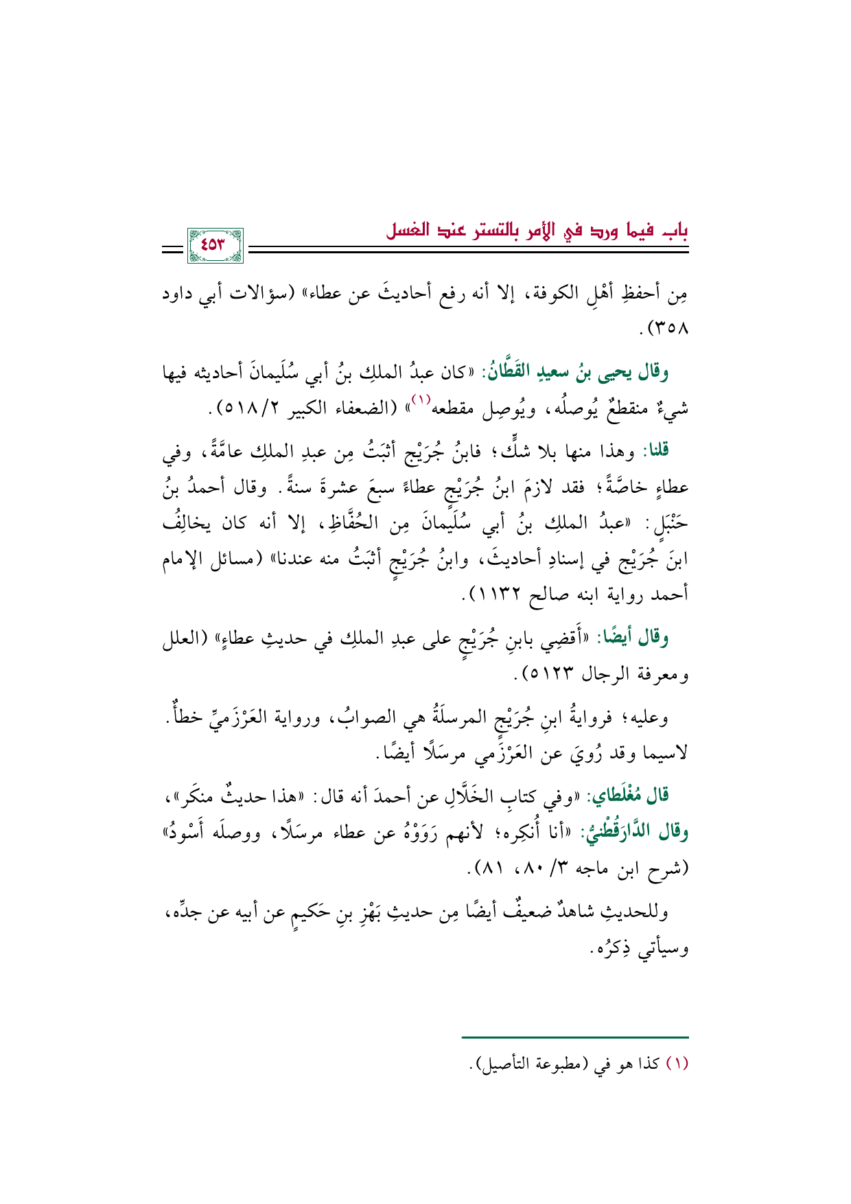 قلنا: وهذا منها بلا شكٍّ؛ فابنُ جُرَيْج أثبَتُ مِن عبدِ الملكِ عامَّةً، وفي عطاءٍ خاصَّةً؛ فقد لازمَ ابنُ جُرَيْجٍ عطاءً سبعَ عشرةَ سنةً. وقال أحمدُ بنُ حَنْبَلٍ: " عبدُ الملكِ بنُ أبي سُلَيمانَ مِن الحُفَّاظِ، إلا أنه كان يخالِفُ ابنَ جُرَيْج في إسنادِ أحاديثَ، وابنُ جُرَيْجٍ أثبَتُ منه عندنا" (مسائل الإمام أحمد رواية ابنه صالح ١١٣٢).