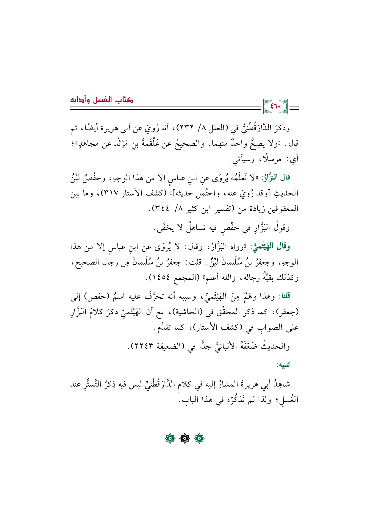 شاهِدُ أبي هريرةَ المشارُ إليه في كلامِ الدَّارَقُطْنيِّ ليس فيه ذِكرُ التَّستُّرِ عند الغُسلِ؛ ولذا لم نَذكُرْه في هذا البابِ.
