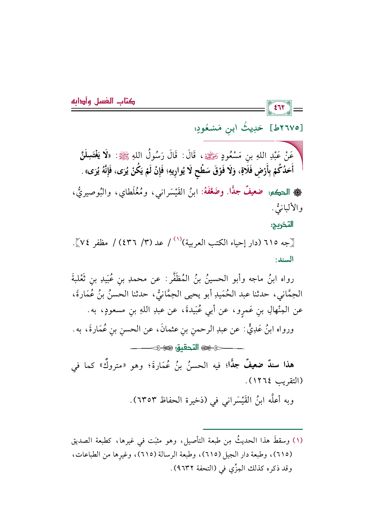 رواه ابنُ ماجه وأبو الحسينُ بنُ المُظَفَّر: عن محمدِ بنِ عُبَيدِ بنِ ثَعْلبةَ الحِمَّاني، حدثنا عبد الحُمَيدِ أبو يحيى الحِمَّانيُّ، حدثنا الحسنُ بنُ عُمَارةَ، عن المِنْهالِ بنِ عَمرٍو، عن أبي عُبَيدةَ، عن عبدِ اللهِ بنِ مسعودٍ، به.