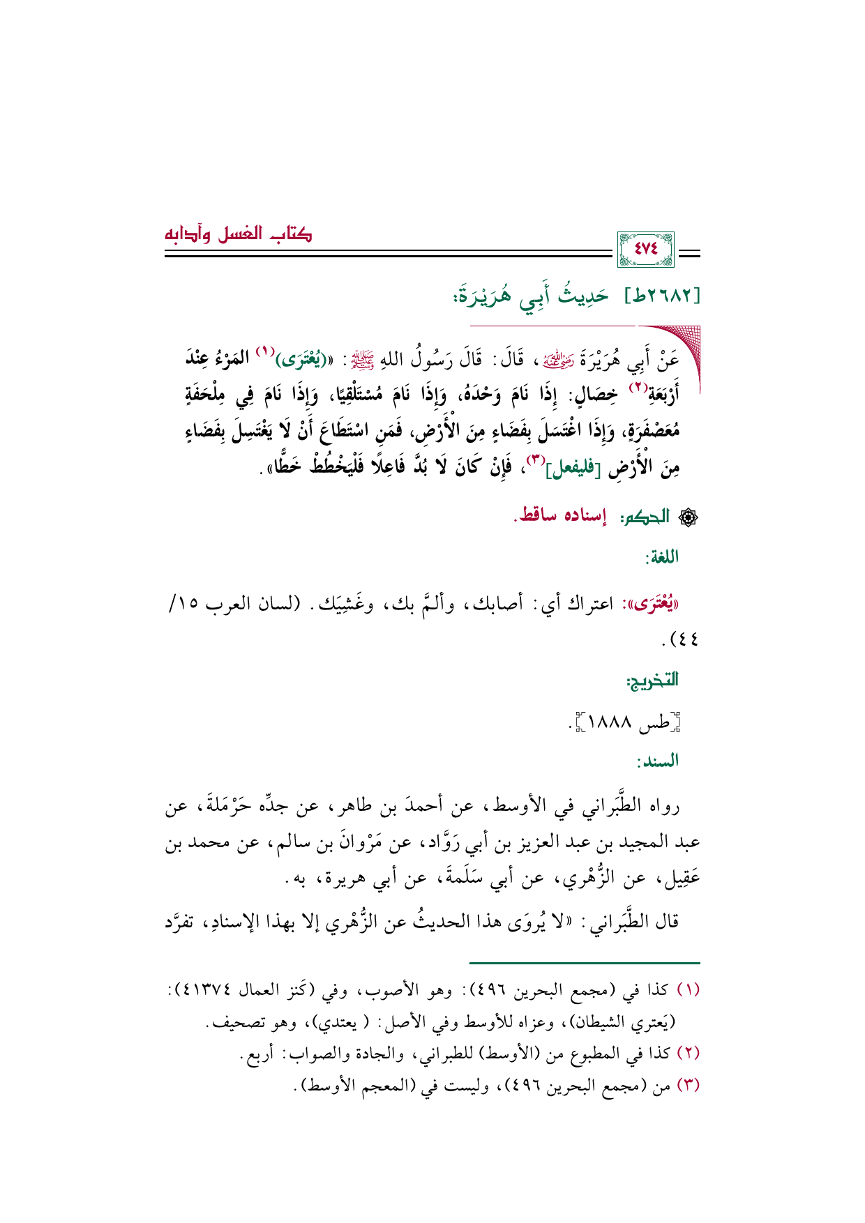 رواه الطَّبَراني في الأوسط، عن أحمدَ بن طاهر، عن جدِّه حَرْمَلةَ، عن عبد المجيد بن عبد العزيز بن أبي رَوَّاد، عن مَرْوانَ بن سالم، عن محمد بن عَقِيل، عن الزُّهْري، عن أبي سَلَمةَ، عن أبي هريرة، به.