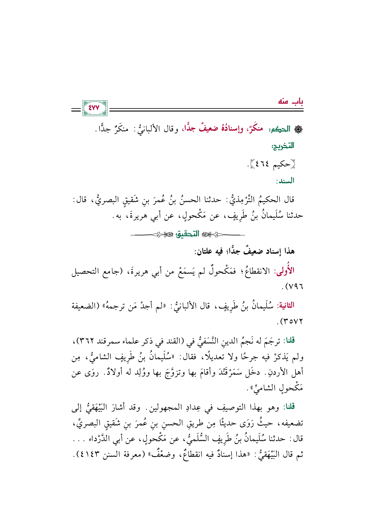 قال الحكيمُ التِّرْمِذيُّ: حدثنا الحسنُ بنُ عُمرَ بنِ شَقيقٍ البصريُّ، قال: حدثنا سُلَيمانُ بنُ طَرِيفٍ، عن مَكْحولٍ، عن أبي هريرةَ، به.