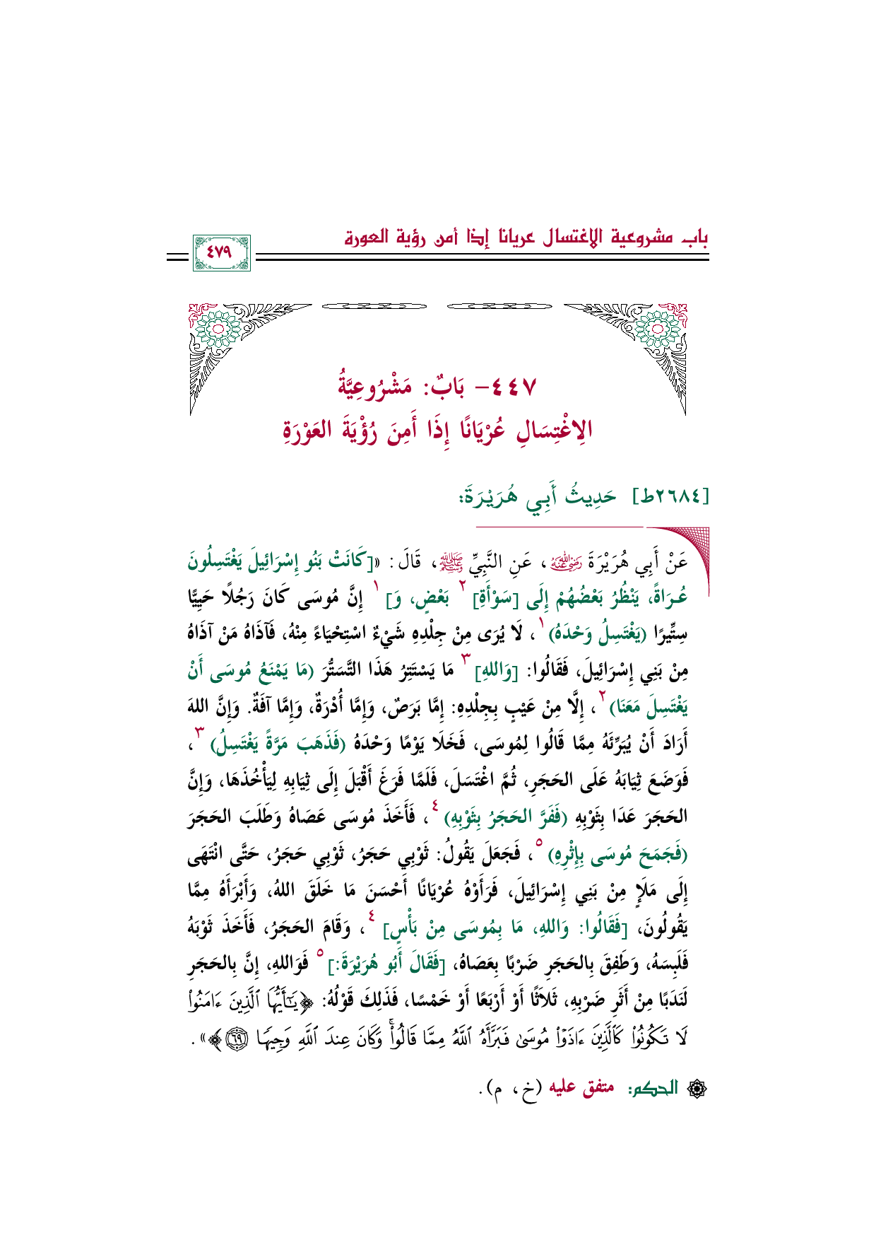 ◼ عَنْ أَبِي هُرَيْرَةَ رضي الله عنه، عَنِ النَّبِيِّ صلى الله عليه وسلم، قَالَ: (([كَانَتْ بَنُو إِسْرَائِيلَ يَغْتَسِلُونَ عُرَاةً، يَنْظُرُ بَعْضُهُمْ إِلَى [سَوْأَةِ] ٢ بَعْضٍ، وَ] ١ إِنَّ مُوسَى كَانَ رَجُلًا حَيِيًّا سِتِّيرًا (يَغْتَسِلُ وَحْدَهُ) ١، لَا يُرَى مِنْ جِلْدِهِ شَيْءٌ اسْتِحْيَاءً مِنْهُ، فَآذَاهُ مَنْ آذَاهُ مِنْ بَنِي إِسْرَائِيلَ، فَقَالُوا: [وَاللهِ] ٣ مَا يَسْتَتِرُ هَذَا التَّسَتُّرَ (مَا يَمْنَعُ مُوسَى أَنْ يَغْتَسِلَ مَعَنَا) ٢، إِلَّا مِنْ عَيْبٍ بِجِلْدِهِ: إِمَّا بَرَصٌ، وَإِمَّا أُدْرَةٌ، وَإِمَّا آفَةٌ. وَإِنَّ اللهَ أَرَادَ أَنْ يُبَرِّئَهُ مِمَّا قَالُوا لِمُوسَى، فَخَلَا يَوْمًا وَحْدَهُ (فَذَهَبَ مَرَّةً يَغْتَسِلُ) ٣، فَوَضَعَ ثِيَابَهُ عَلَى الحَجَرِ، ثُمَّ اغْتَسَلَ، فَلَمَّا فَرَغَ أَقْبَلَ إِلَى ثِيَابِهِ لِيَأْخُذَهَا، وَإِنَّ الحَجَرَ عَدَا بِثَوْبِهِ (فَفَرَّ الحَجَرُ بِثَوْبِهِ) ٤، فَأَخَذَ مُوسَى عَصَاهُ وَطَلَبَ الحَجَرَ (فَجَمَحَ مُوسَى بِإِثْرِهِ) ٥، فَجَعَلَ يَقُولُ: ثَوْبِي حَجَرُ، ثَوْبِي حَجَرُ، حَتَّى انْتَهَى إِلَى مَلَإٍ مِنْ بَنِي إِسْرَائِيلَ، فَرَأَوْهُ عُرْيَانًا أَحْسَنَ مَا خَلَقَ اللهُ، وَأَبْرَأَهُ مِمَّا يَقُولُونَ، [فَقَالُوا: وَاللهِ، مَا بِمُوسَى مِنْ بَأْسٍ] ٤، وَقَامَ الحَجَرُ، فَأَخَذَ ثَوْبَهُ فَلَبِسَهُ، وَطَفِقَ بِالحَجَرِ ضَرْبًا بِعَصَاهُ، [فَقَالَ أَبُو هُرَيْرَةَ: ] ٥ فَوَاللهِ، إِنَّ بِالحَجَرِ لَنَدَبًا مِنْ أَثَرِ ضَرْبِهِ، ثَلاثًا أَوْ أَرْبَعًا أَوْ خَمْسًا، فَذَلِكَ قَوْلُهُ: {يَا أَيُّهَا الَّذِينَ آمَنُوا لَا تَكُونُوا كَالَّذِينَ آذَوْا مُوسَى فَبَرَّأَهُ اللهُ مِمَّا قَالُوا وَكَانَ عِنْدَ اللهِ وَجِيهًا})).