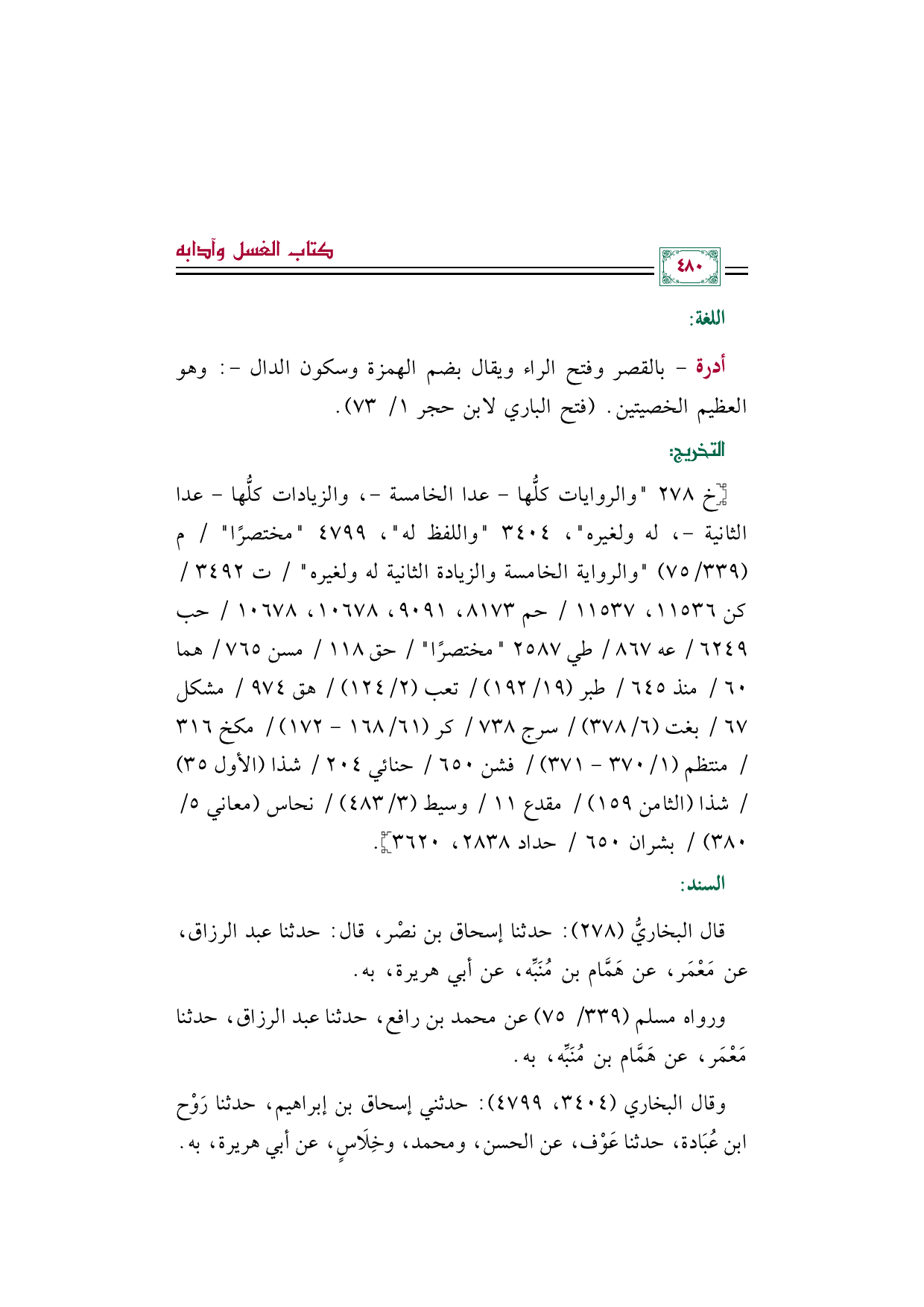 قال البخاريُّ (٢٧٨): حدثنا إسحاق بن نصْر، قال: حدثنا عبد الرزاق، عن مَعْمَر، عن هَمَّام بن مُنَبِّه، عن أبي هريرة، به.