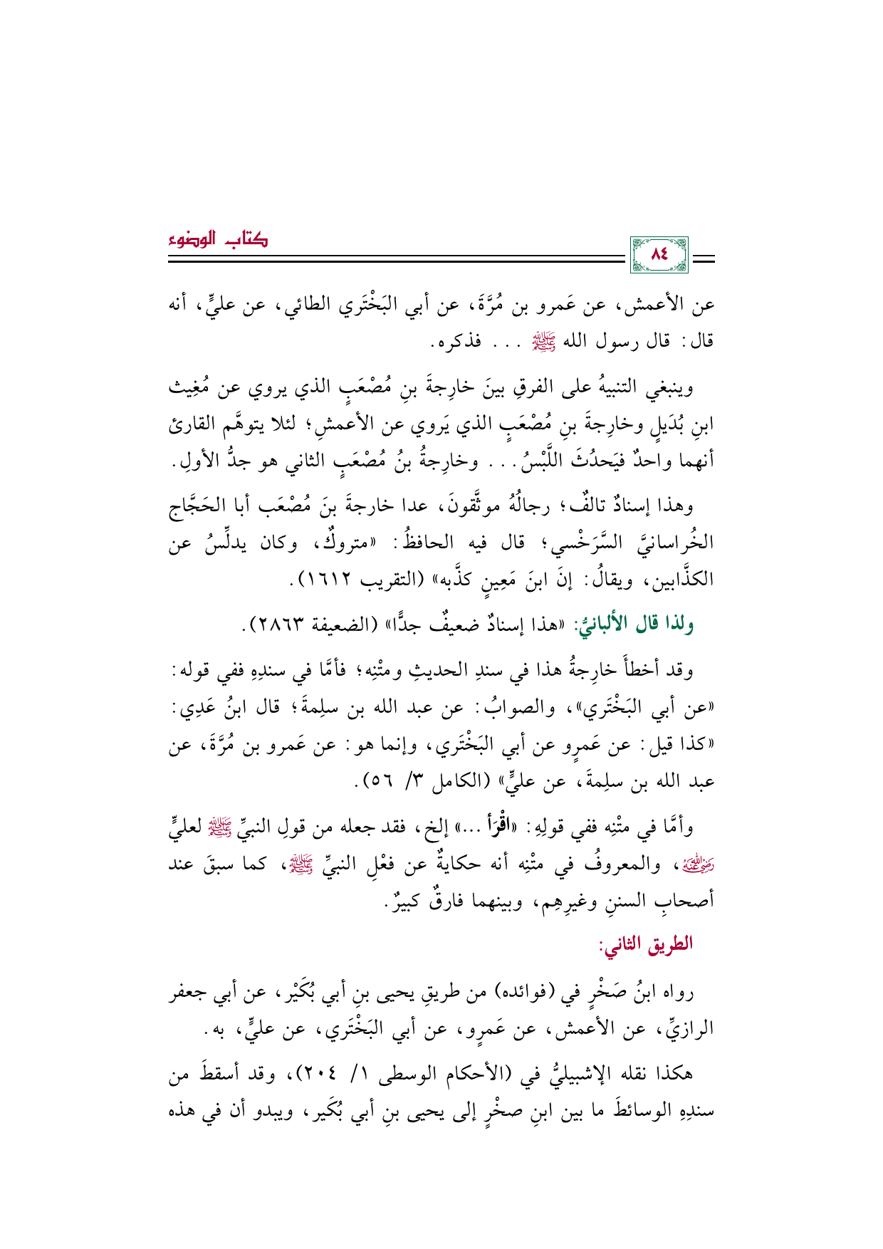 وقد أخطأَ خارِجةُ هذا في سندِ الحديثِ ومتْنِه؛ فأمَّا في سندِهِ ففي قوله: "عن أبي البَخْتَري"، والصوابُ: عن عبد الله بن سلِمةَ؛ قال ابنُ عَدِي: "كذا قيل: عن عَمرٍو عن أبي البَخْتَري، وإنما هو: عن عَمرو بن مُرَّةَ، عن عبد الله بن سلِمةَ، عن عليٍّ" (الكامل ٣/ ٥٦).