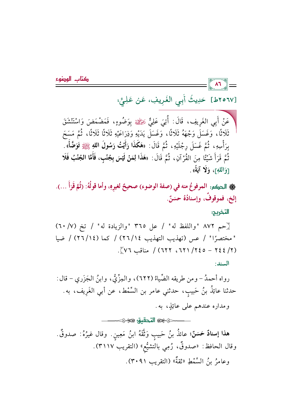 رواه أحمدُ -ومن طريقه الضِّياءُ (٦٢٢)، والمِزِّيُّ، وابنُ الجَزَري- قال: حدثنا عائِذُ بنُ حَبيبٍ، حدثني عامر بن السِّمْط، عن أبي الغَرِيف، به.