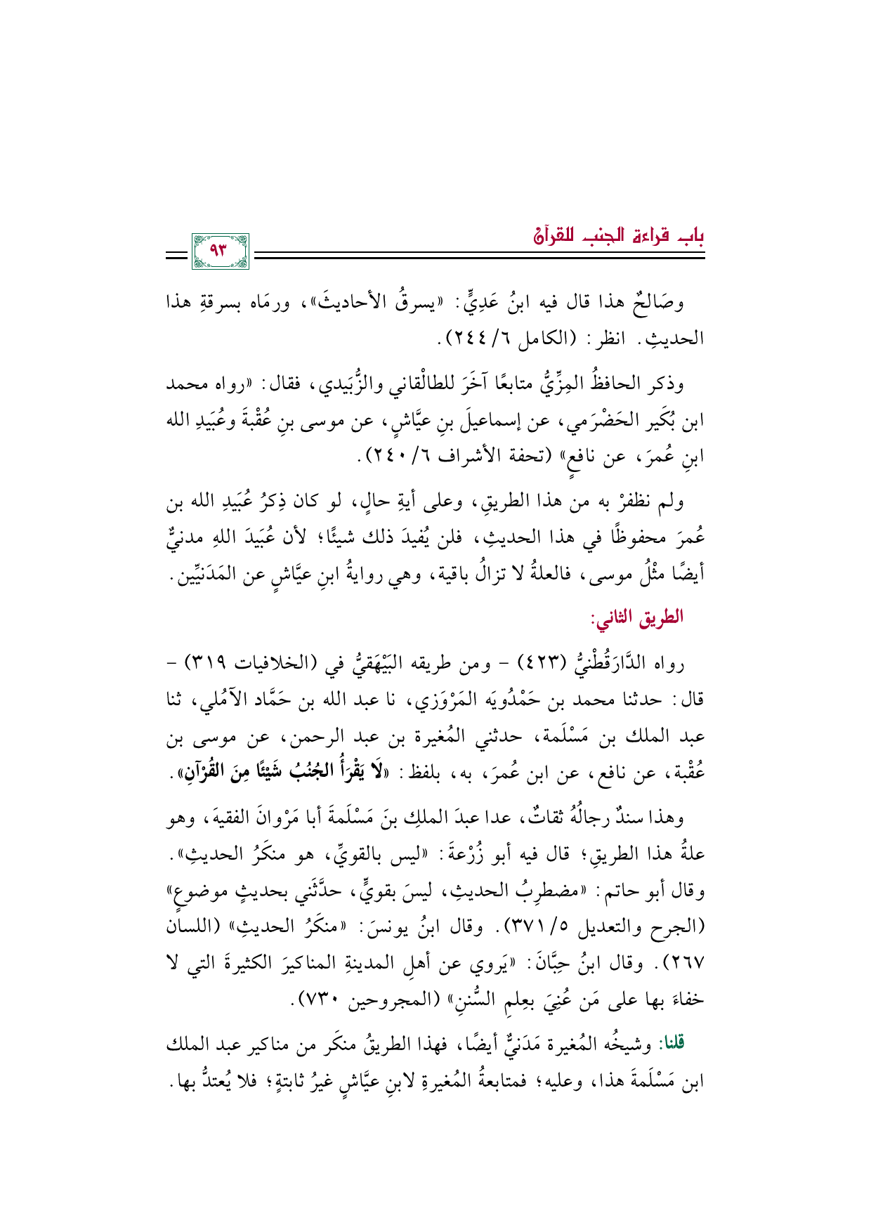 رواه الدَّارَقُطْنيُّ (٤٢٣) -ومن طريقه البَيْهَقيُّ في (الخلافيات ٣١٩) - قال: حدثنا محمد بن حَمْدُويَه المَرْوَزي، نا عبد الله بن حَمَّاد الآمُلي، ثنا عبد الملك بن مَسْلَمة، حدثني المُغيرة بن عبد الرحمن، عن موسى بن عُقْبة، عن نافع، عن ابن عُمرَ، به، بلفظ: ((لَا يَقْرَأُ الجُنُبُ شَيْئًا مِنَ القُرْآنِ)).