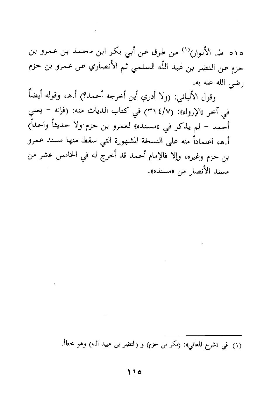 515-ط. الأنوار) من طرق عن أبي بكر ابن محمد بن عمرو بن حزم عن النضر بن عبد الله السلمي ثم الأنصاري عن عمرو بن حزم رضي الله عنه به.