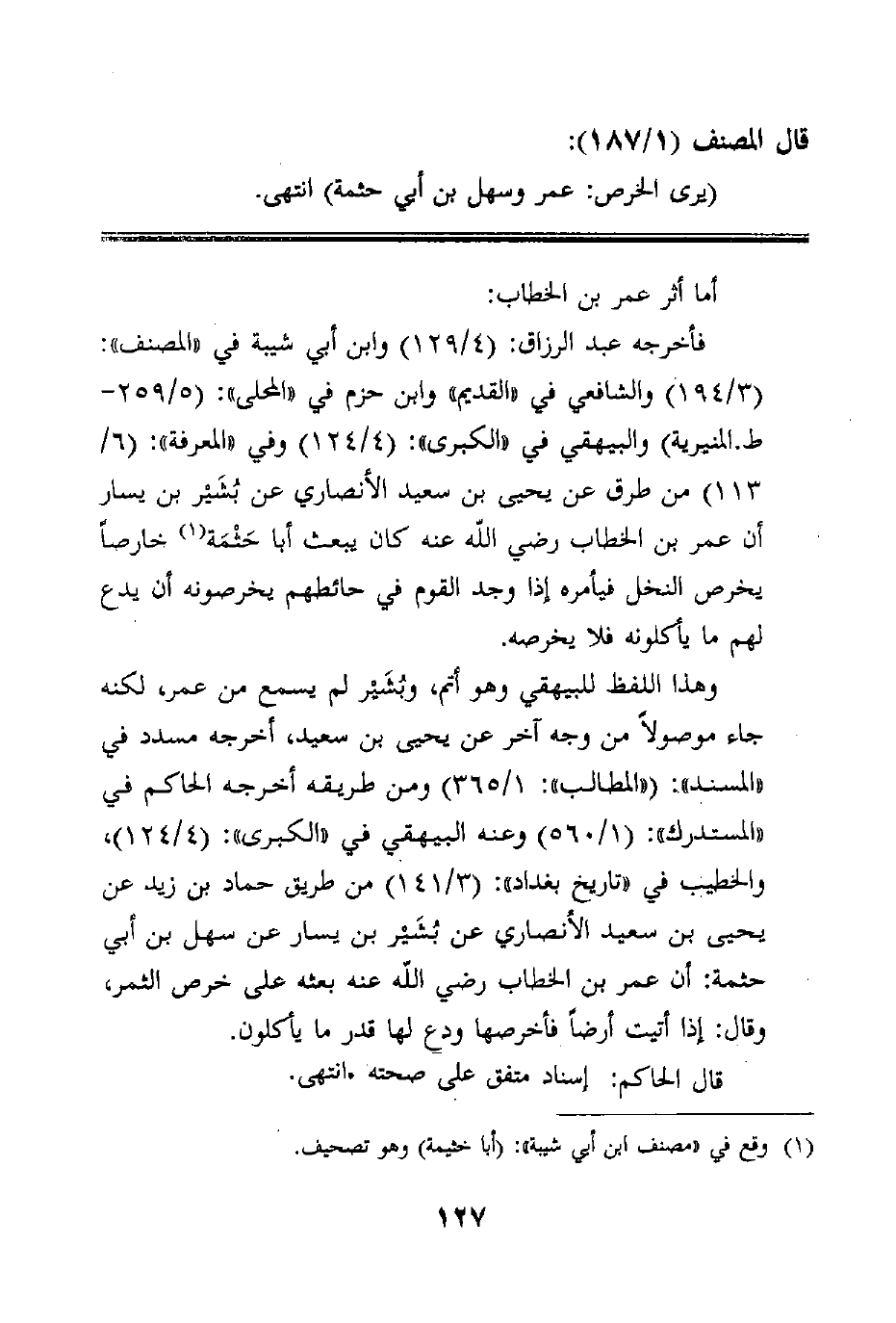 فأخرجه عبد الرزاق: (4/129) وابن أبي شيبة في "المصنف": (3/194) والشافعي في "القديم" وابن حزم في "المحلى": (5/259-ط. المنيرية) والبيهقي في "الكبرى": (4/124) وفي "المعرفة": (6/113) من طرق عن يحيى بن سعيد الأنصاري عن بُشَيْر بن يسار أن عمر بن الخطاب رضي الله عنه كان يبعث أبا حَثْمَة خارصاً يخرص النخل فيأمره إذا وجد القوم في حائطهم يخرصونه أن يدع لهم ما يأكلونه فلا يخرصه.